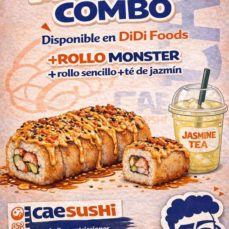 Rollo GIGANTE de camarones tempura y surimi por dentro, forrado de salmón y aguacate, acompañado con un topping de mechas de kanikama ( cangrejo ) con Tampico y atún aderezo especial de la casa.