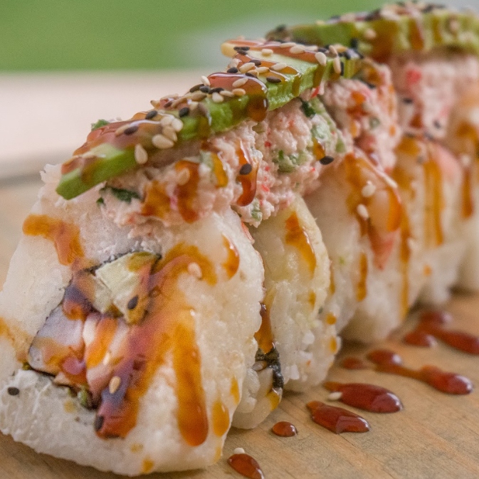 Rollo GIGANTE de surimi y camarón por dentro, forrado de aguacate por fuera y con topping de queso crema con kanikama, furikake y serrano. Salsa de anguila y ajonjoli