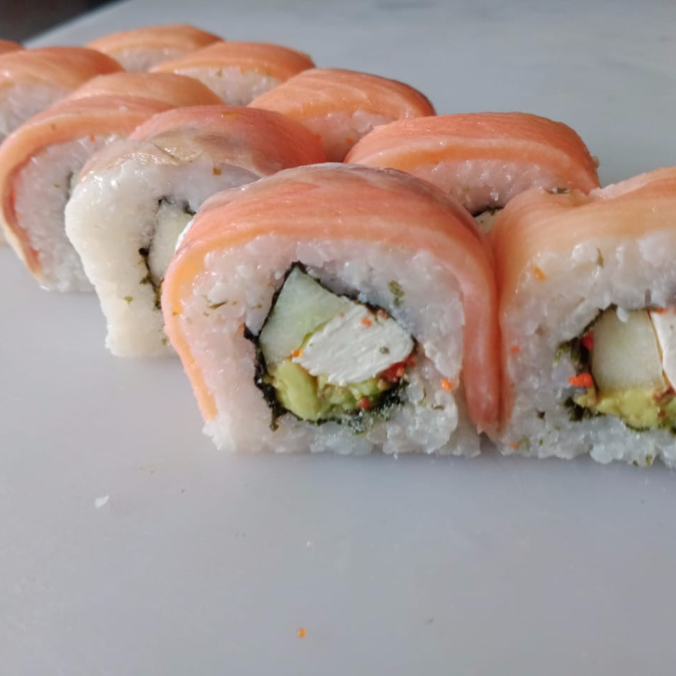 Por dentro pepino, aguacate, queso y masago, por fuera salmón