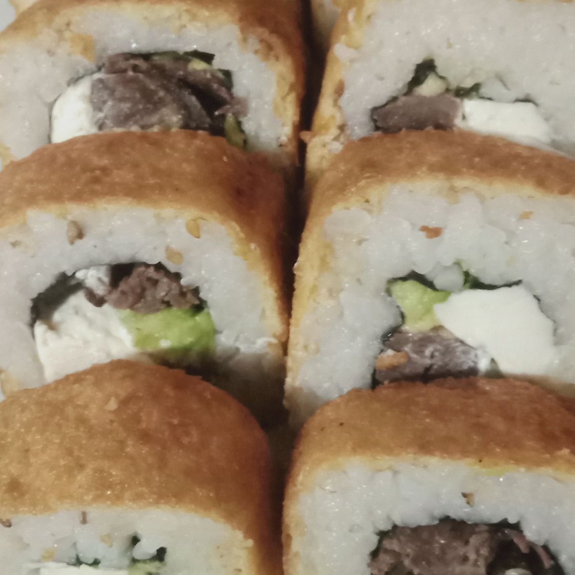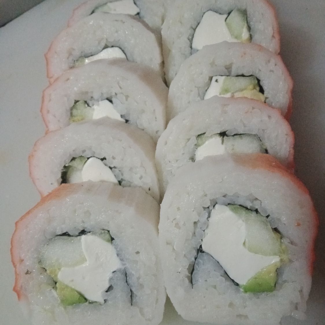 Por dentro pepino, aguacate y surimi, por fuera queso crema.