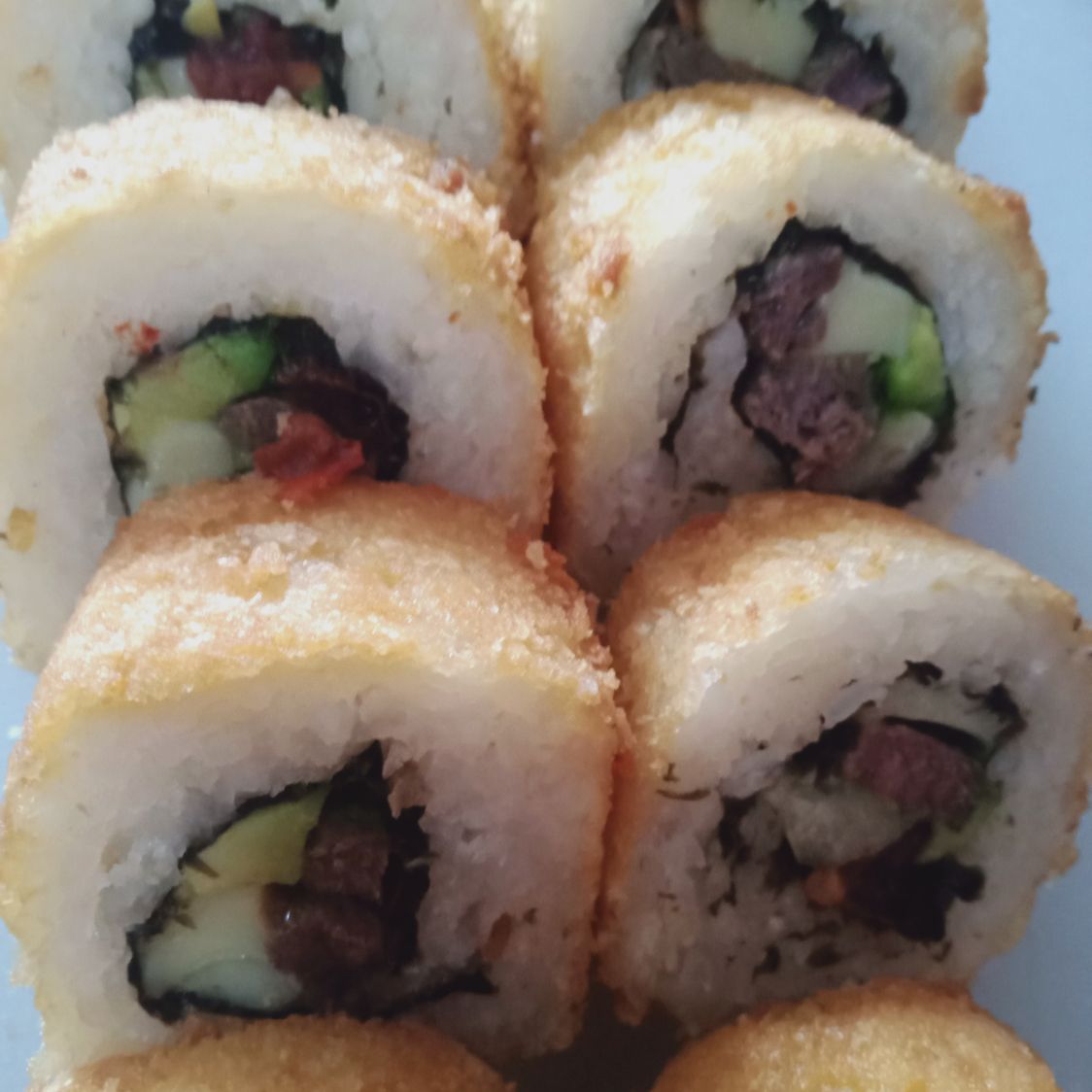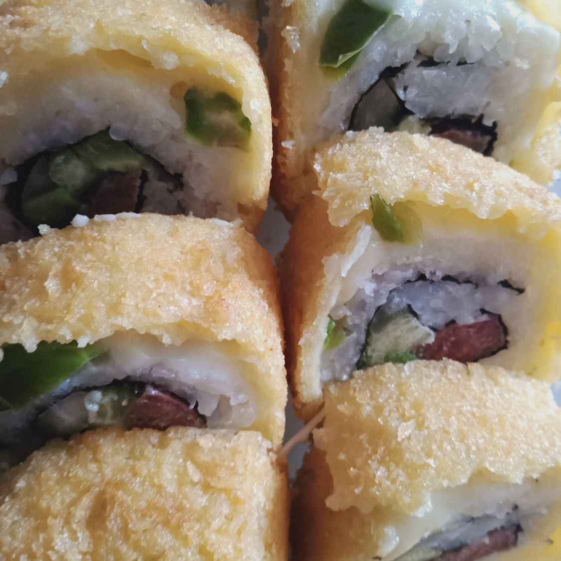 Por dentro pepino, aguacate, surimi y queso crema al exterior empanizado.