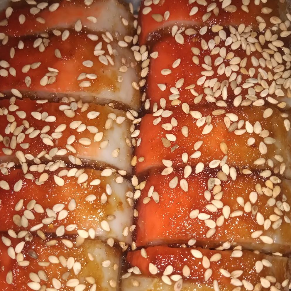 Por dentro pepino, queso, aguacate y camarón, por fuera cangrejo, bañado en salsa dulce y ajonjolí.