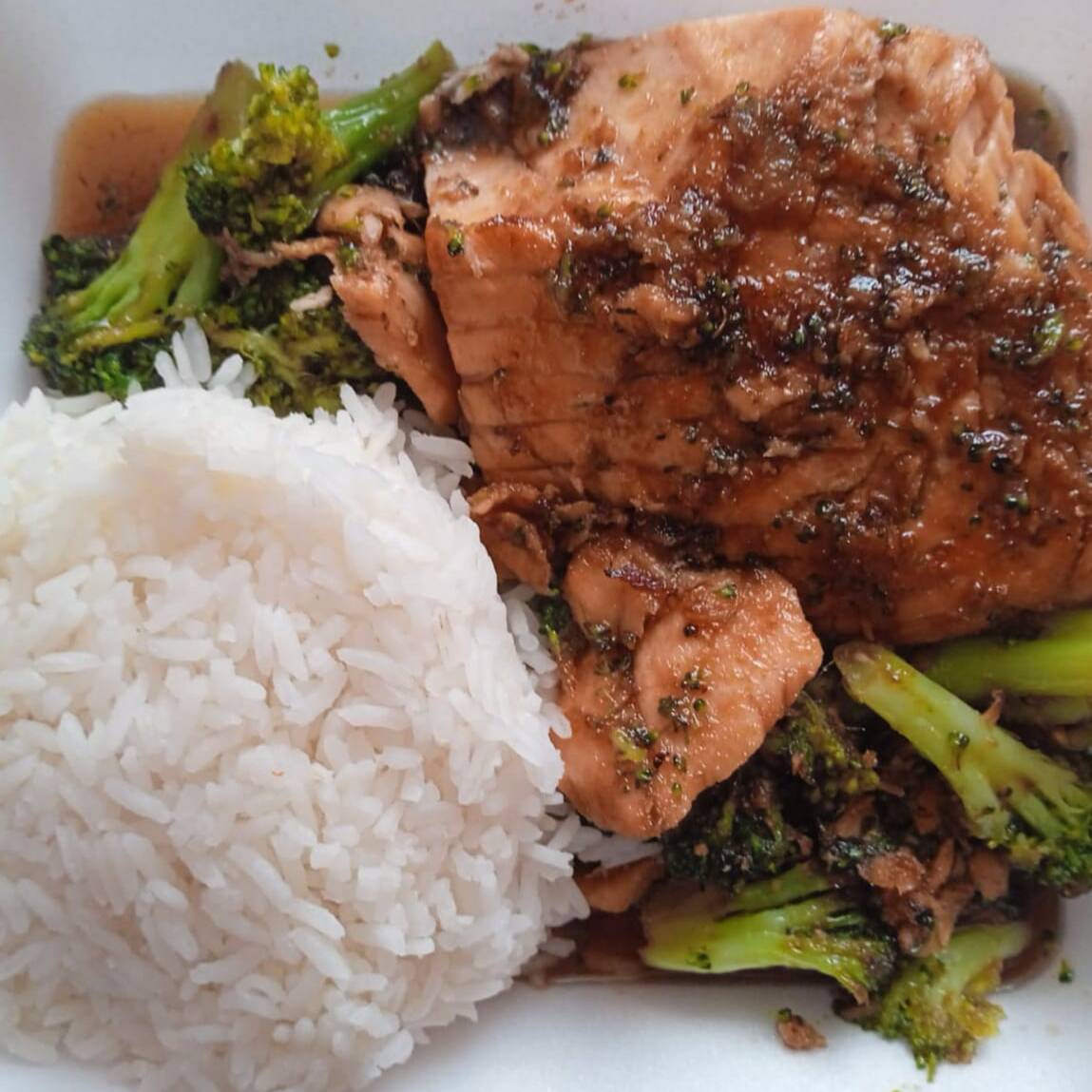 Brocolí, salmón en salsa teriyaki con guarnición de gohan.