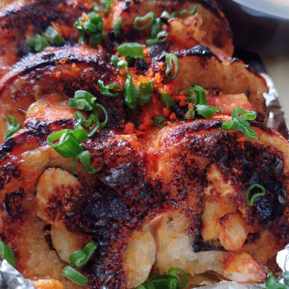 Por dentro camarón empanizado y pepino por fuera alga, empanizado y bañado en salsa dulce, salsa especial, masago y cebollín.
