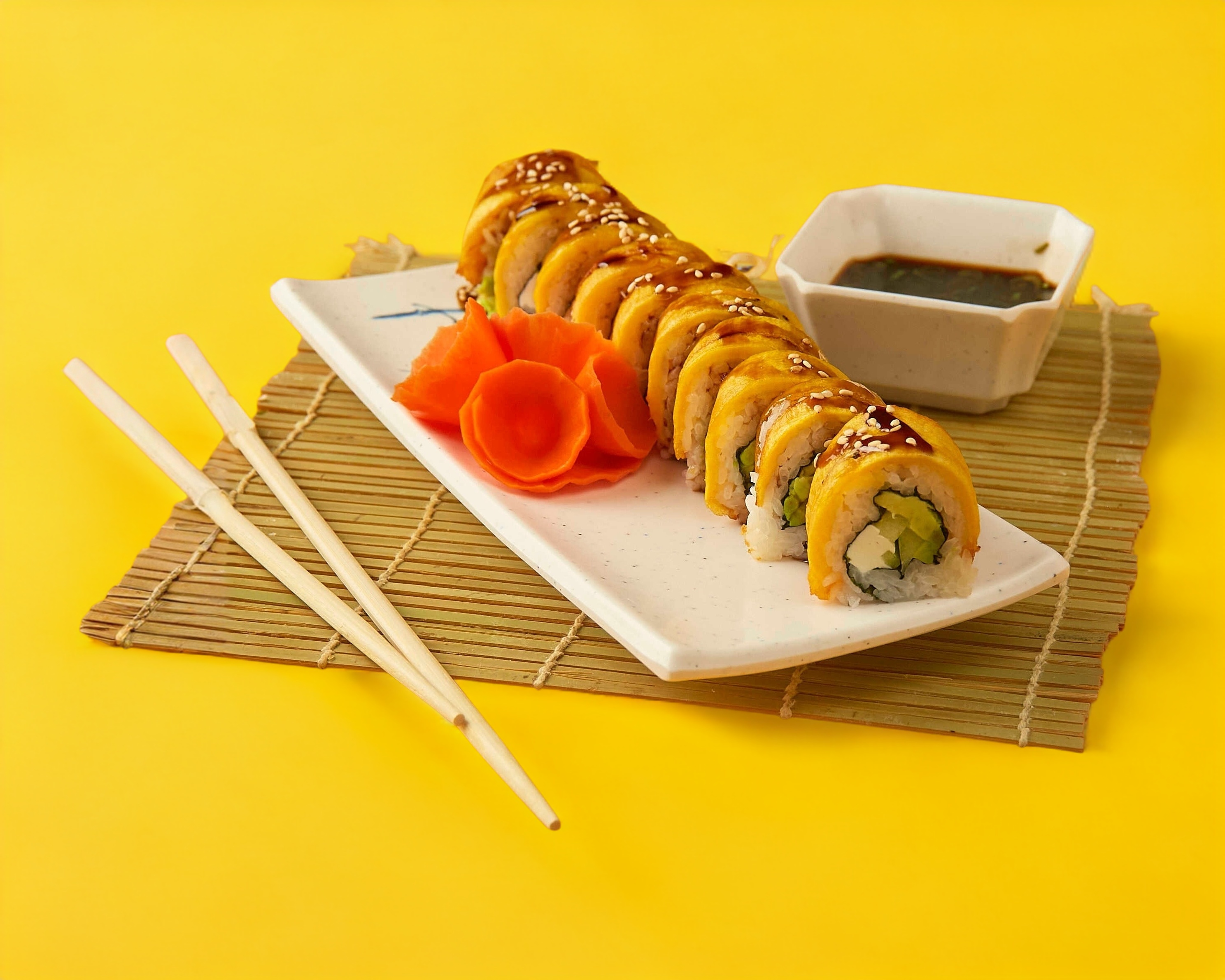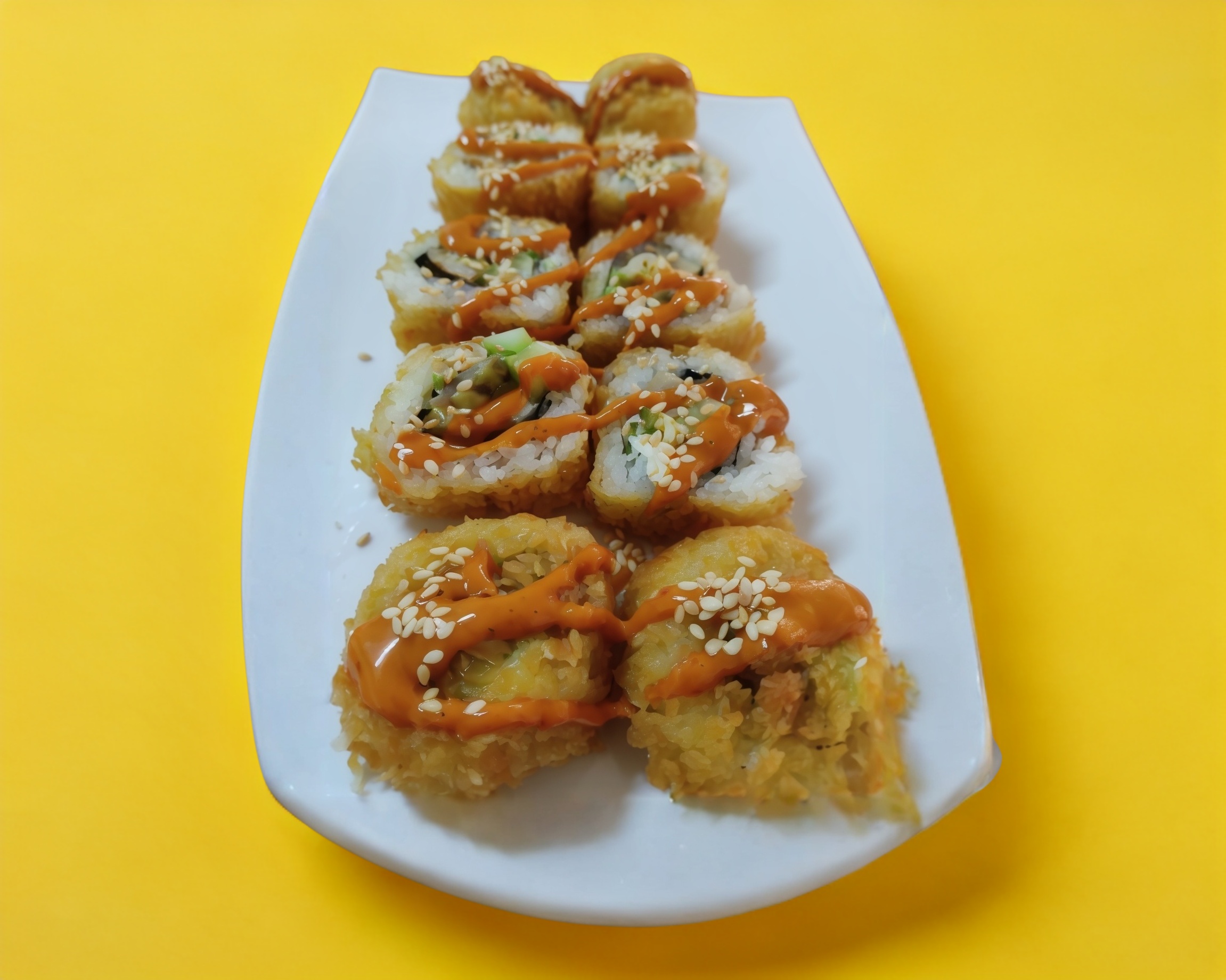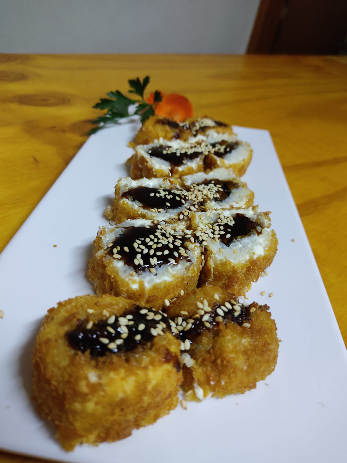 Aguacate, pepino y queso philadelphia. Plátano frito bañando de salsa de anguila y ajonjolí.