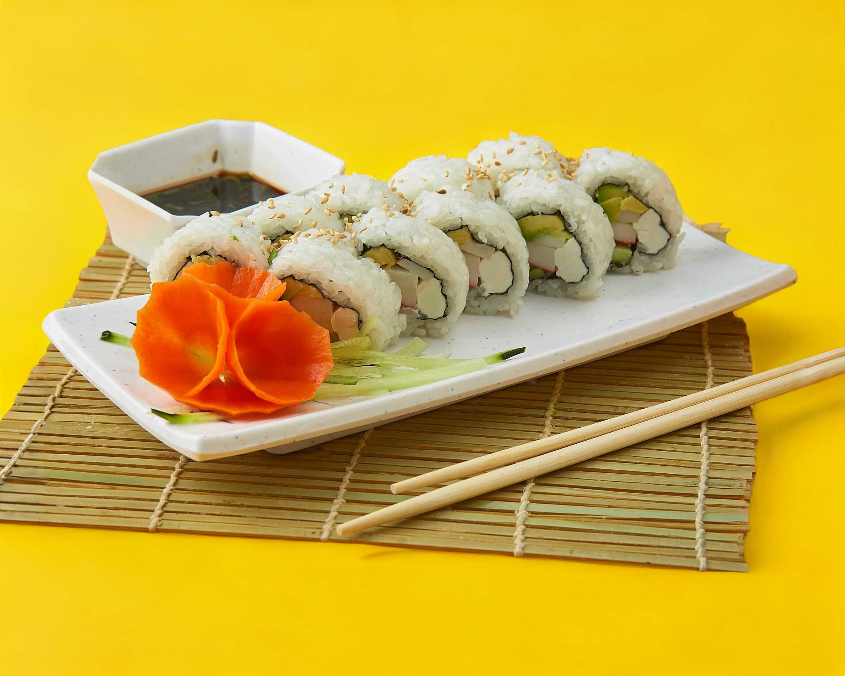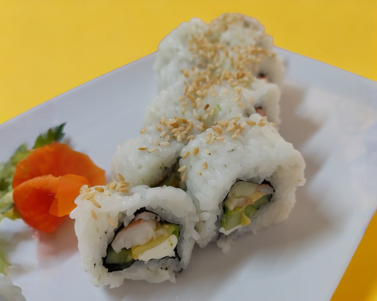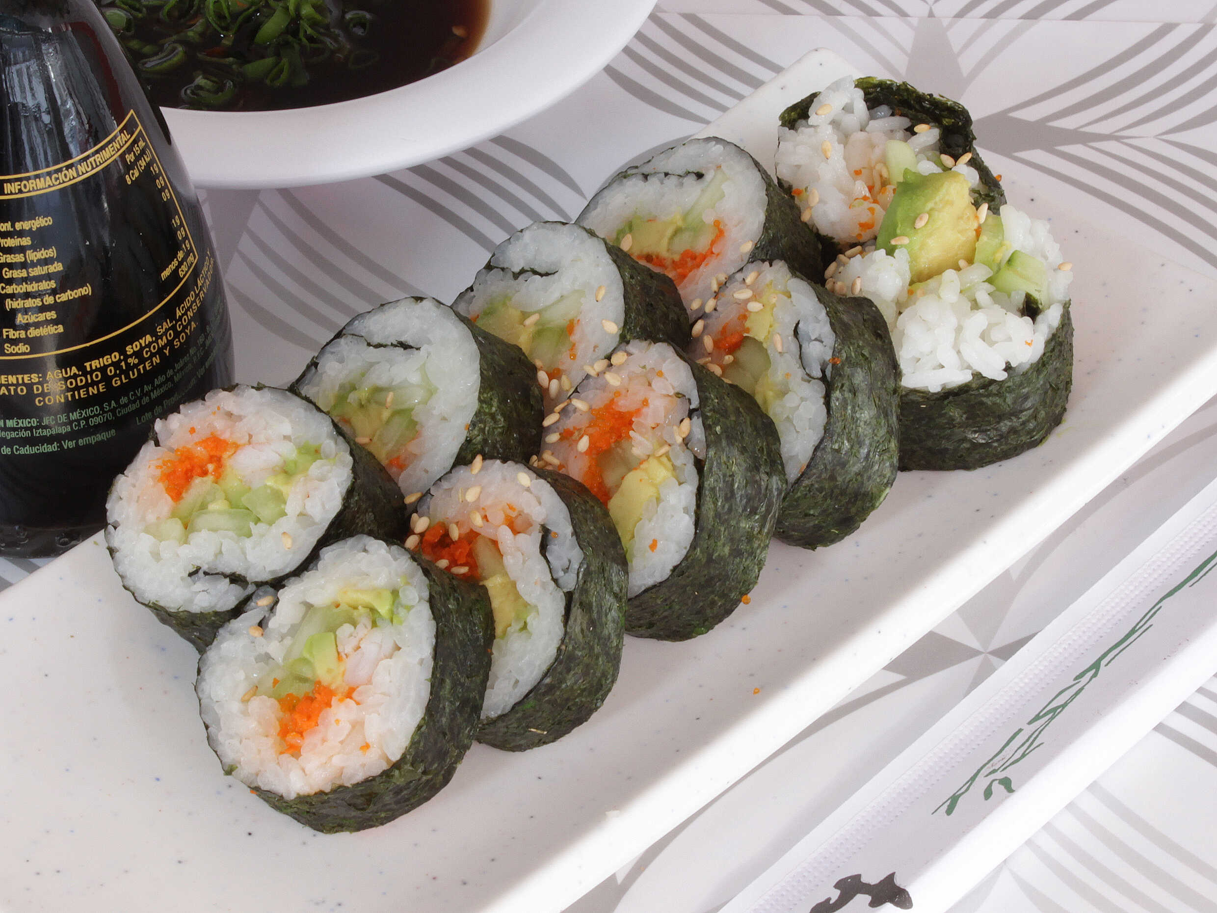 Camarón, masago, pepino y aguacate. Alga y ajonjolí.