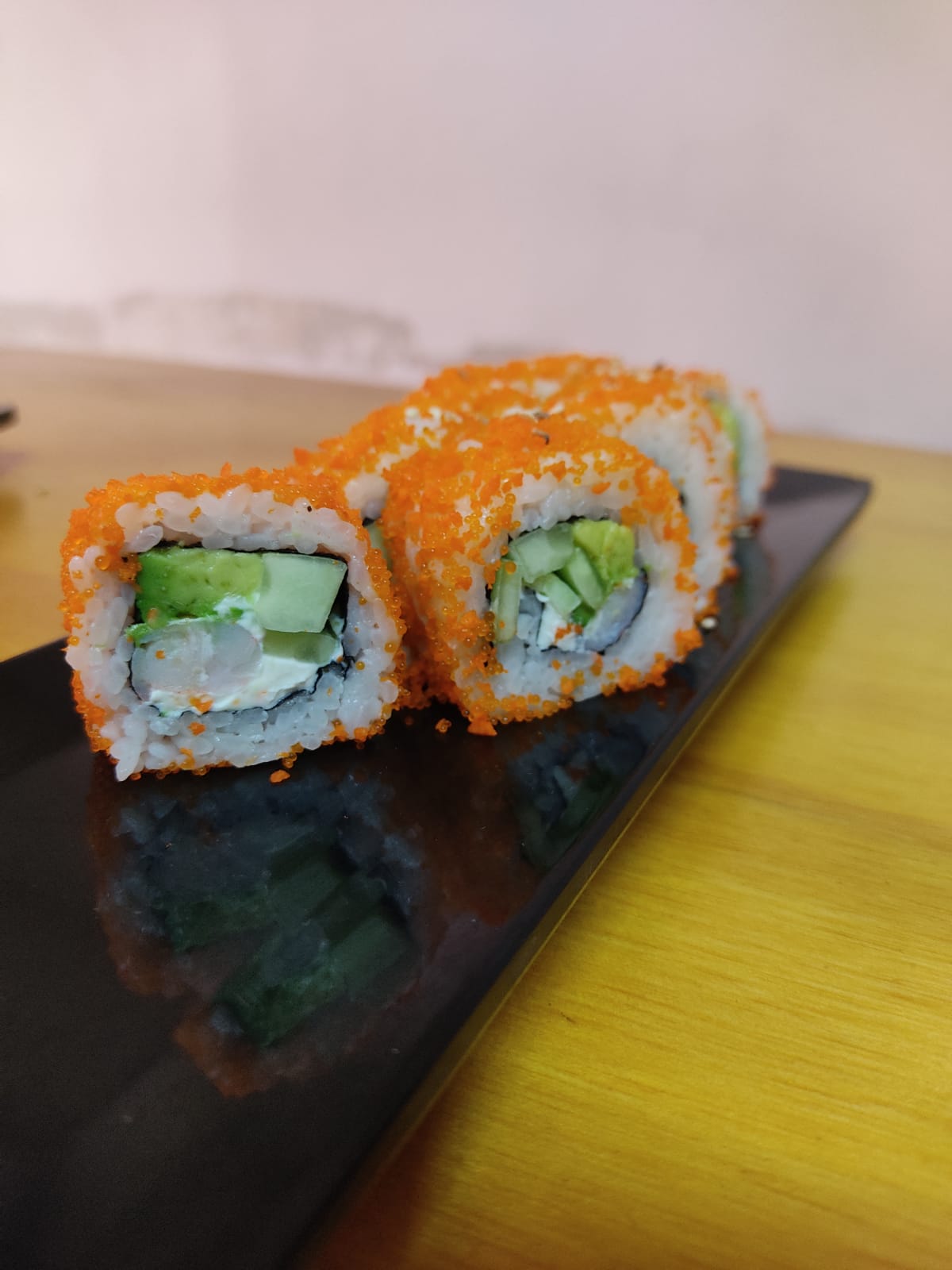 Aguacate, pepino por dentro, por fuera queso Philadelphia bañado de masago y tampico encima.