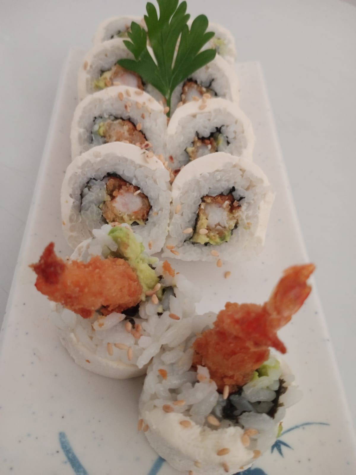 Por dentro: Aguacate, queso philadelphia y camarón empanizado. Por fuera: Arroz y ajonjolí.