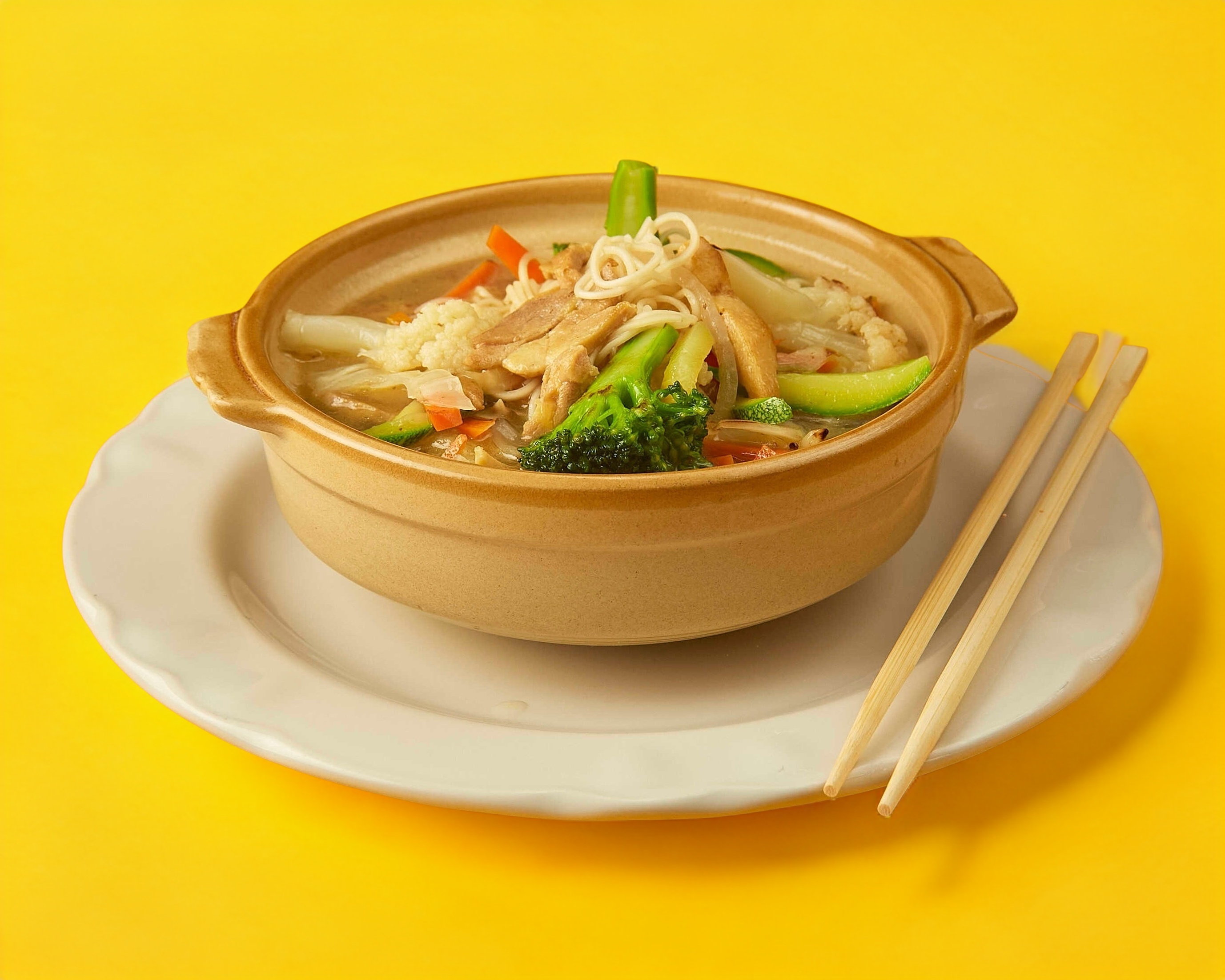 Fideo en caldo acompañado de deliciosos cortes de pollo y verduras.