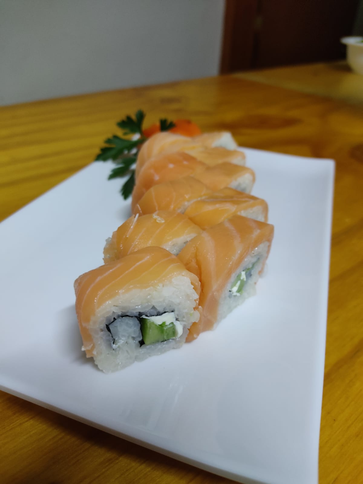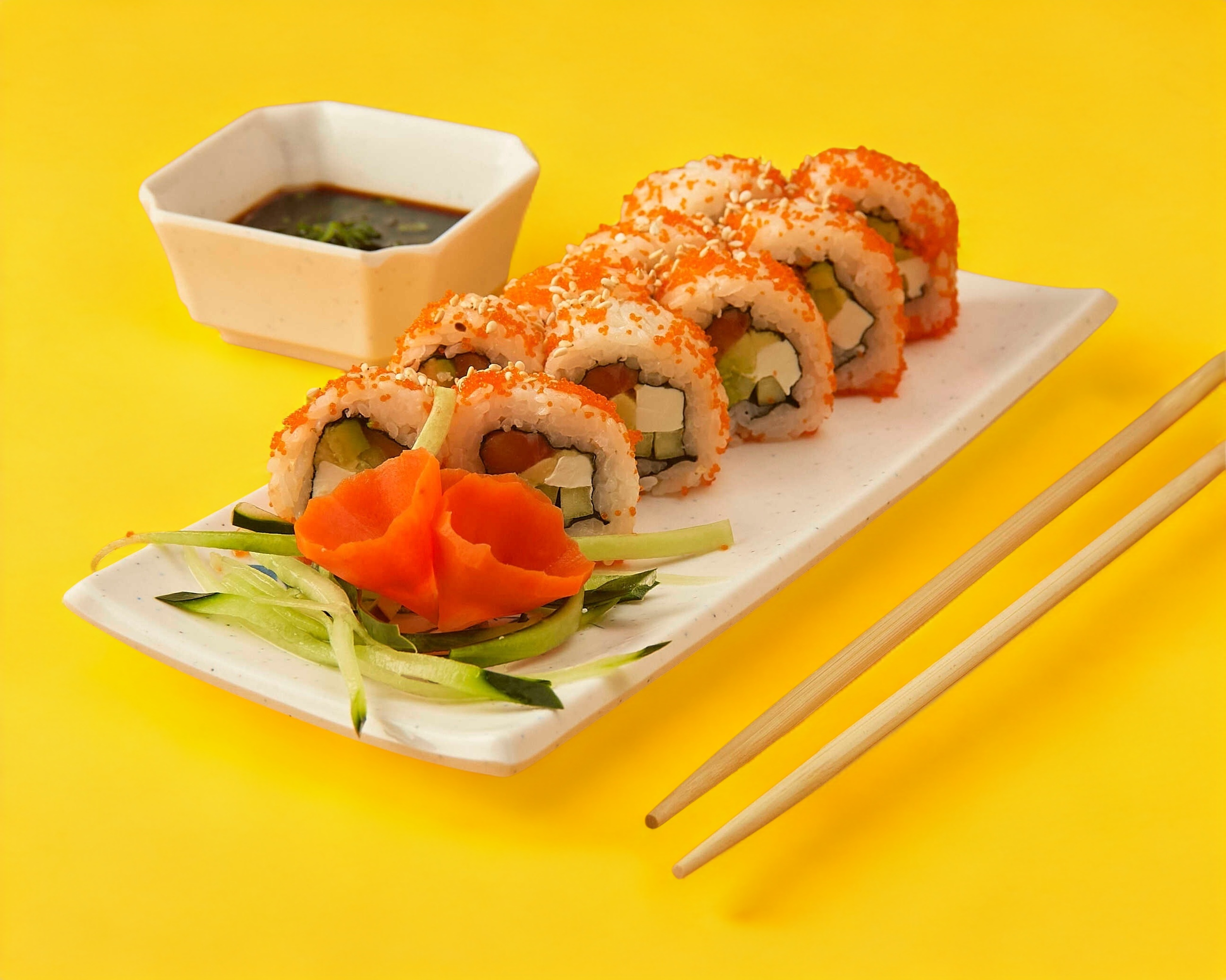 Salmón, pepino, aguacate y queso philadelphia. Masago y ajonjolí.