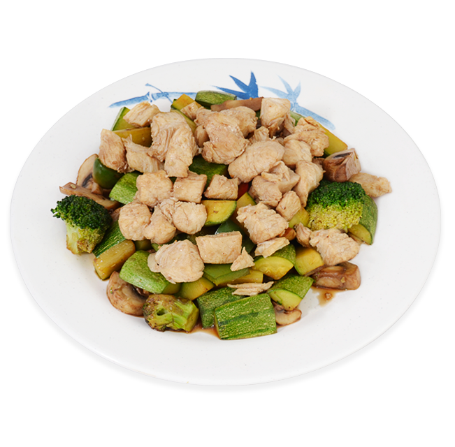 Pollo con verduras, fideo grueso y salsa teriyaki de la casa.