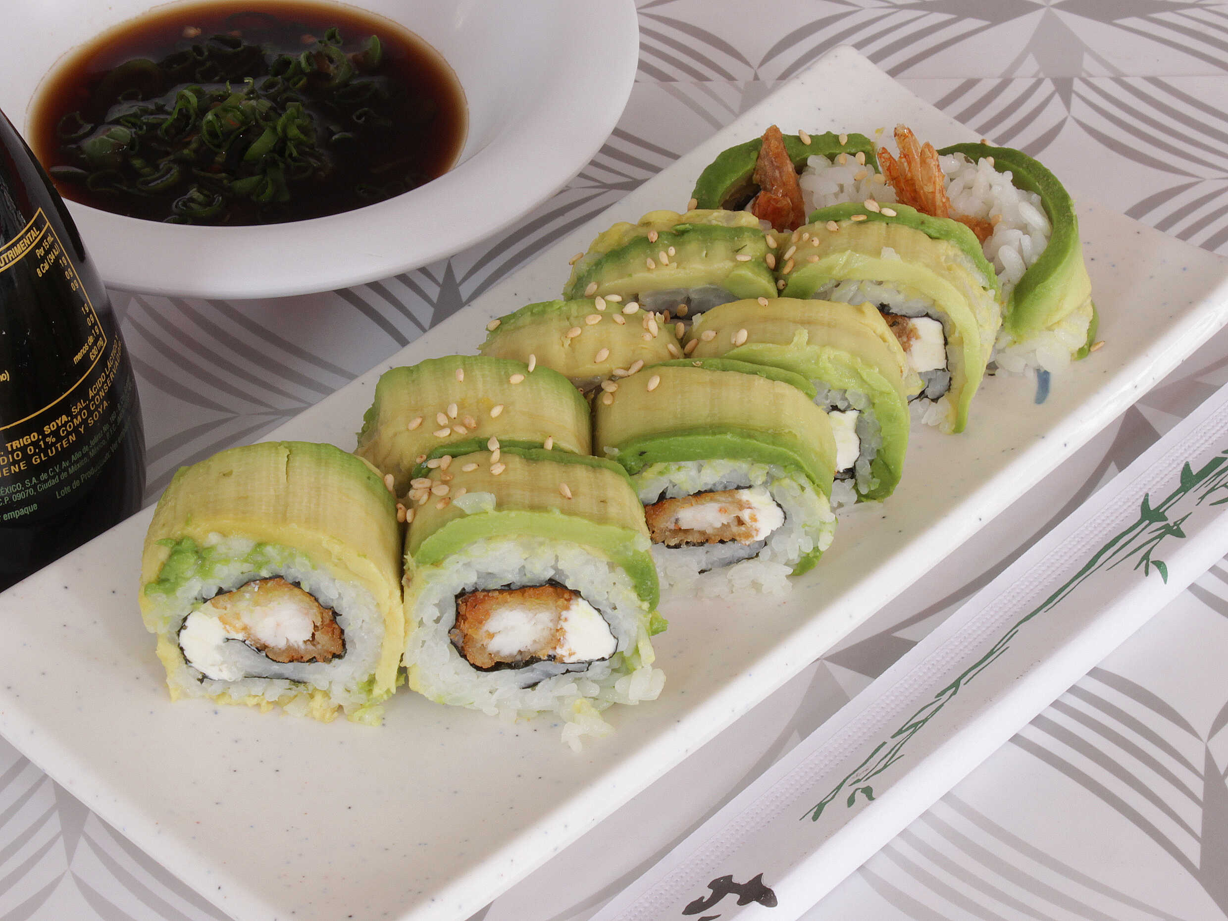 Queso philadelphia, aguacate, tampico y verdura capeada. Alga bañado de salsa de anguila y ajonjolí.