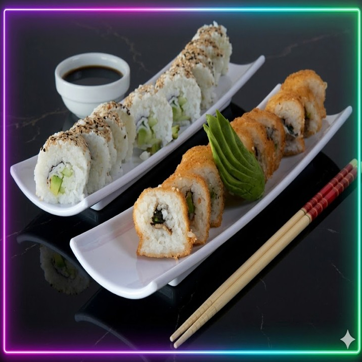 1/2 Rollo Califronia Cangrejo*1 + 1/2 Rollo de Kappa Maki*1 + 1/2 Rollo Empanizado Arrachera*1 + 1 Niguiri Camarón*1 + 1 Niguiri Tampico*1 + 2 Kushuiages Plátano*1