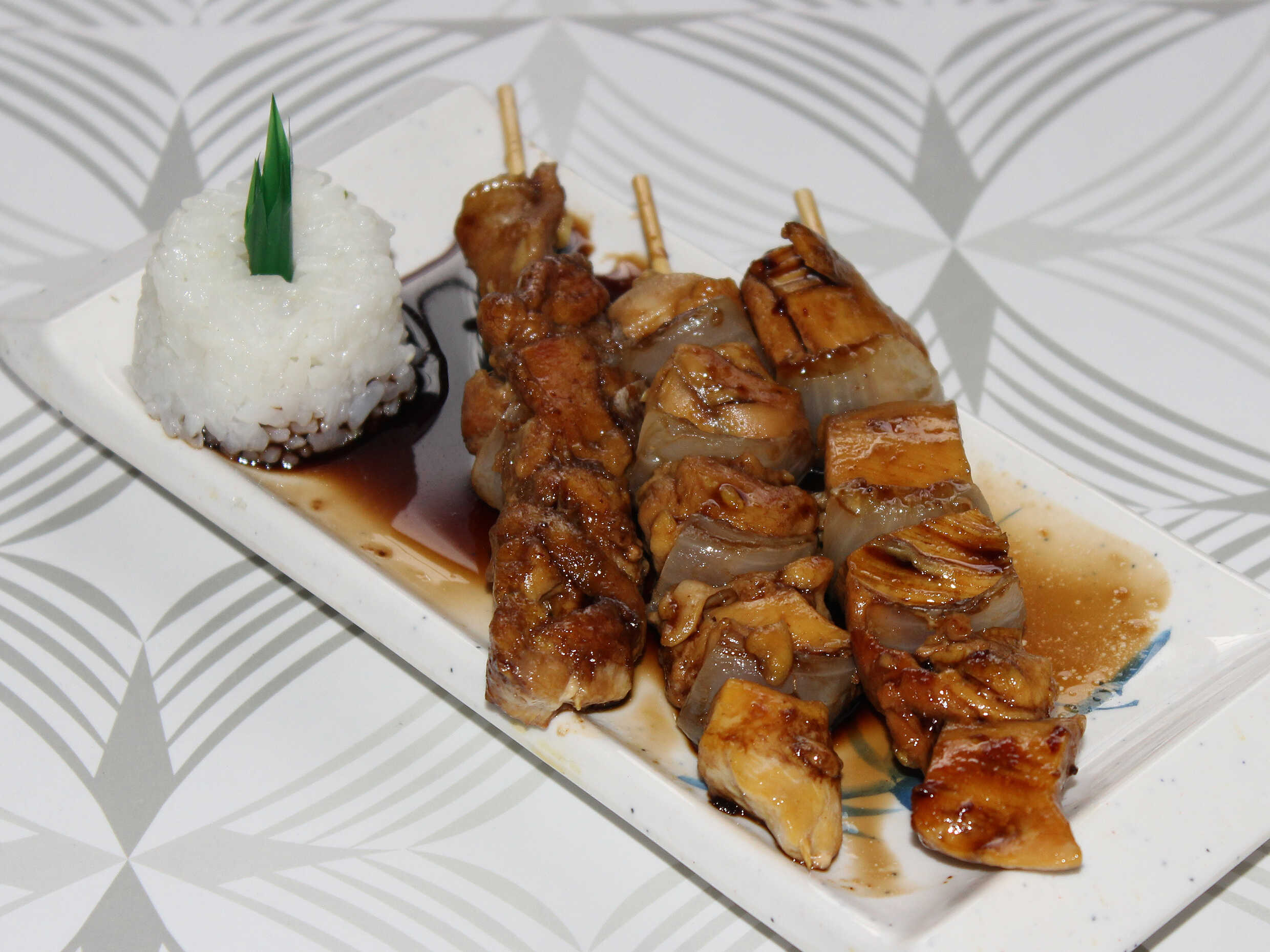 3 Piezas. Brocheta de pollo con cebolla a la plancha, bañados con salsa teriyaki.