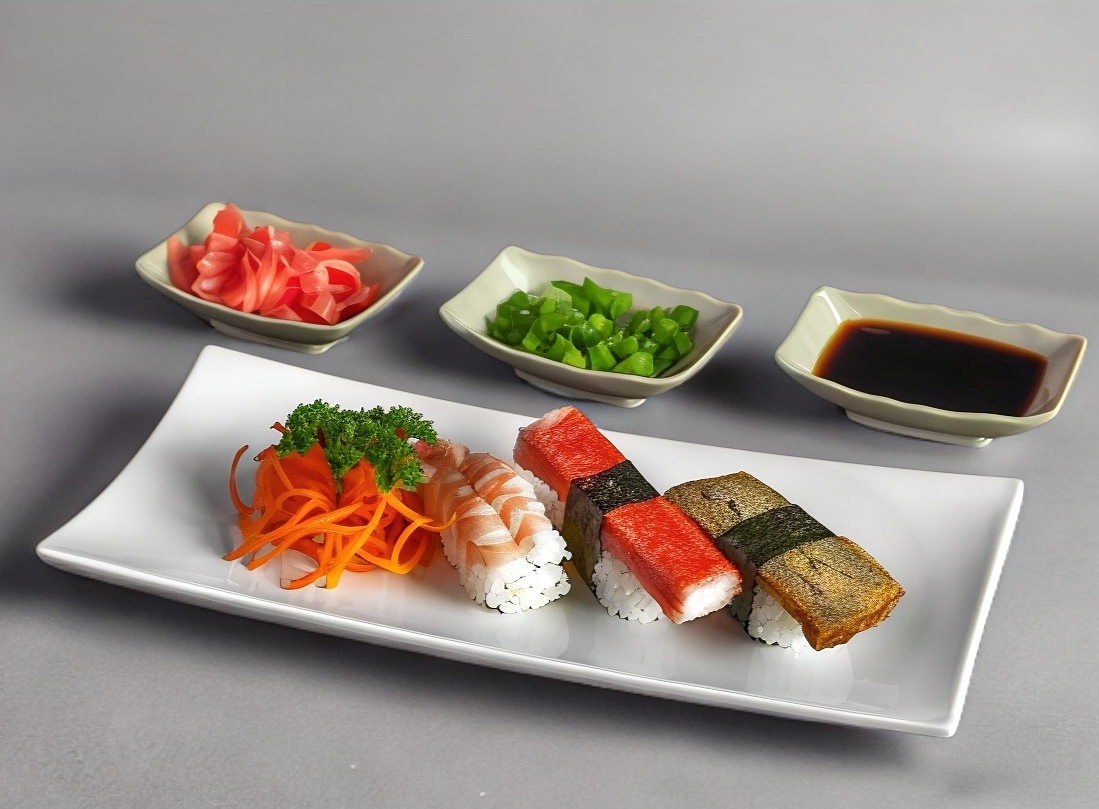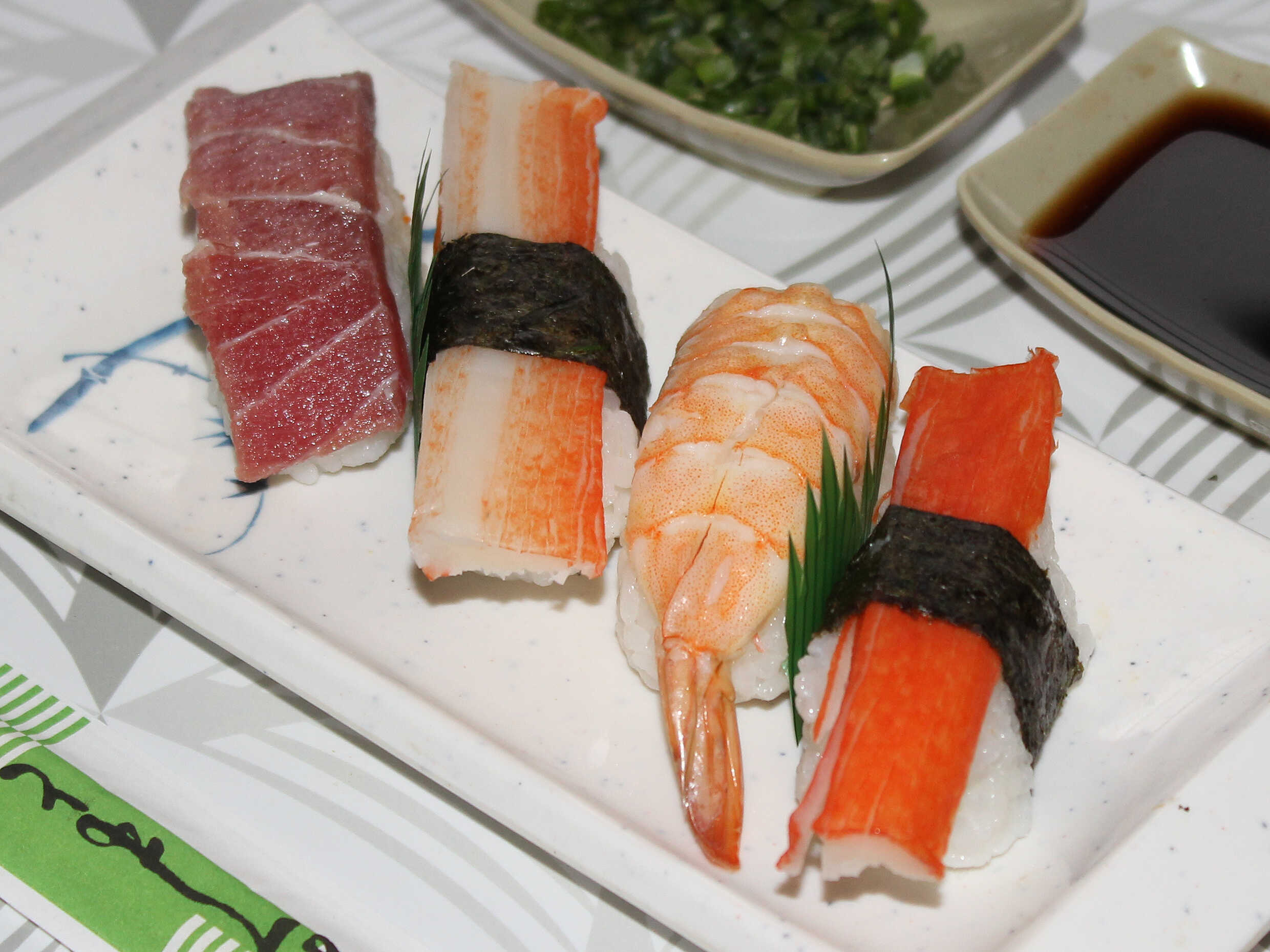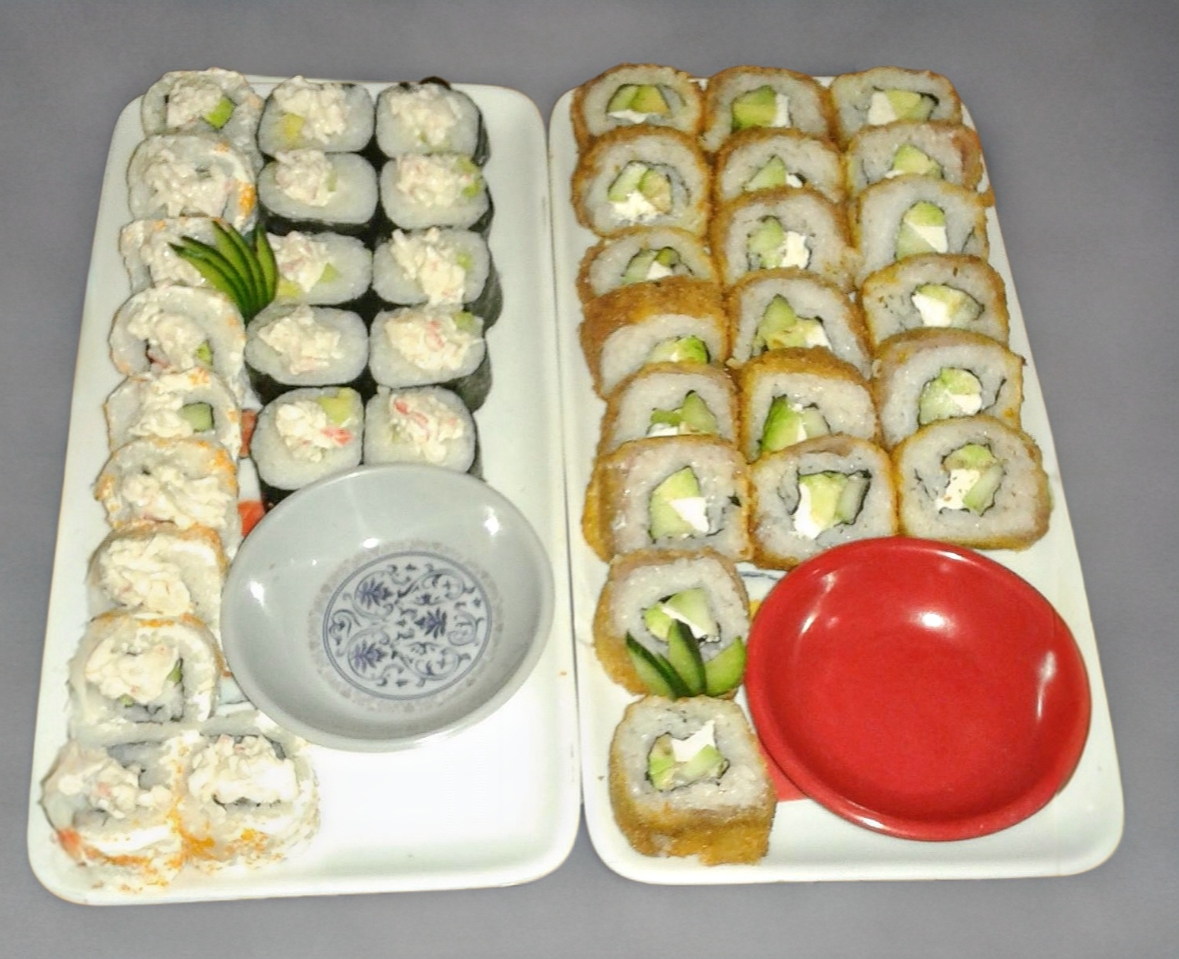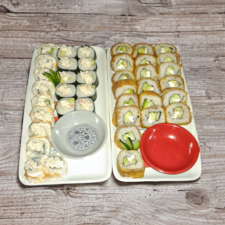 4 Piezas de rollos california, 4 piezas de rollos philadelphia, 4 piezas de rollos maki especial, 2 conos tampico, 2 nigiris de camarón, nigiri de atún y 2 nigiris de cangrejo.