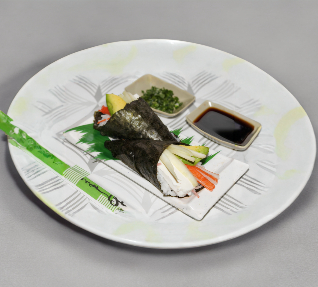 Cono relleno con arroz, pepino, aguacate y queso philadelphia.