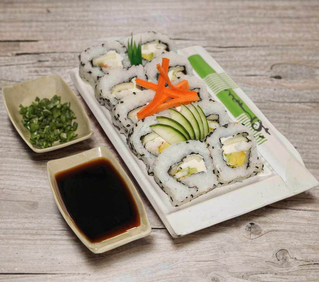 Cangrejo, pepino, aguacate al centro y queso philadelphia por fuera, espolvoreado de ajonjolí.
