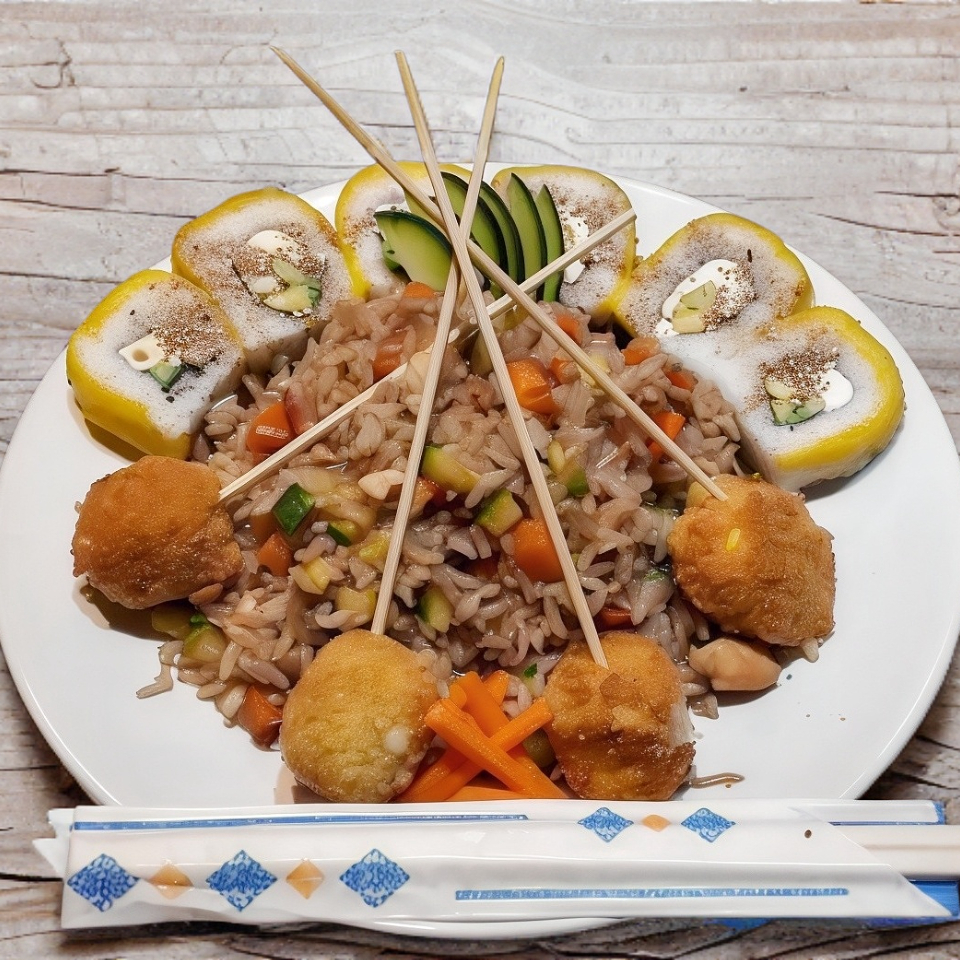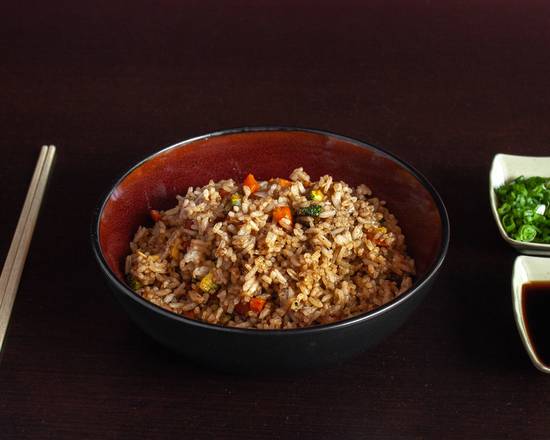 Arroz japonés frito a la plancha acompañado de verduras picadas, pollo y res.