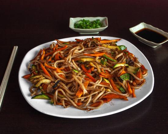 Pasta japonesa con pollo, camaron, cebollín, zanahoria, calabaza y champiñón en salsa teriyaki.