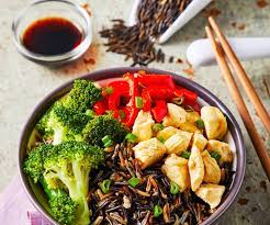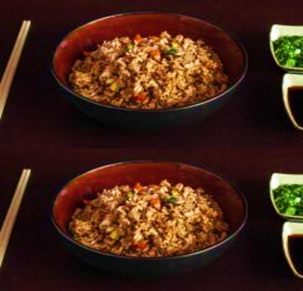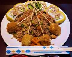 Arroz japonés frito a la plancha acompañado de verduras picadas, pollo y res.
