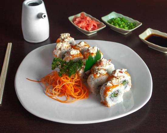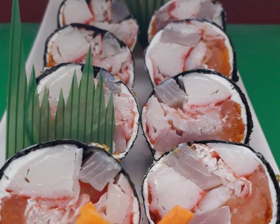 Salmon Cangrejo Masago Aguacate Queso Alga Piel de Pepino por Fuera