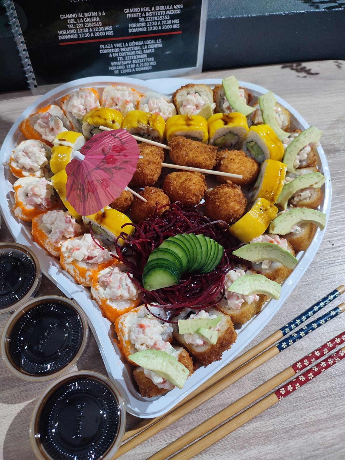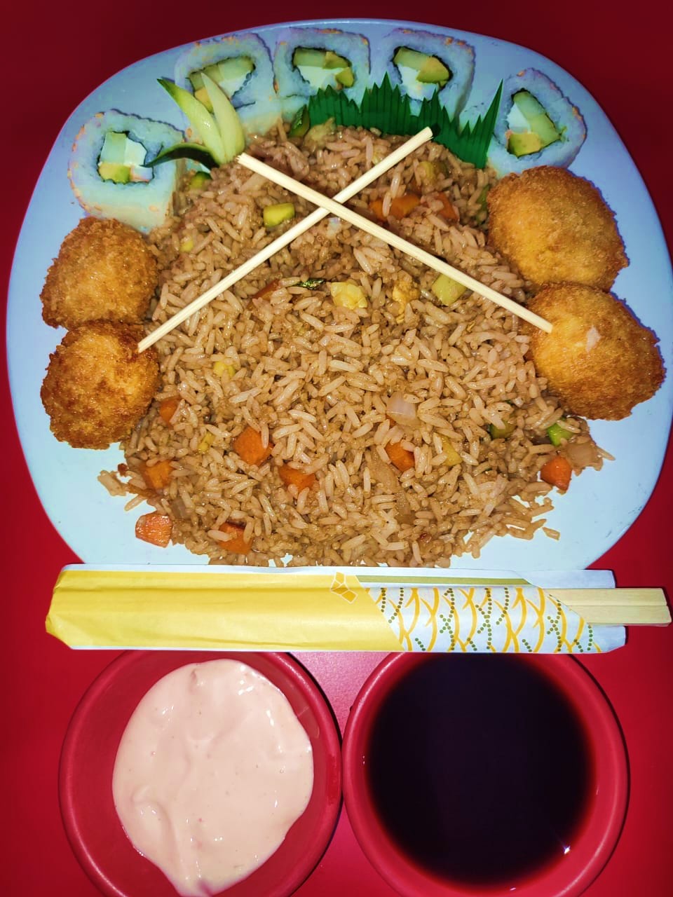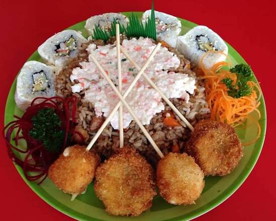 1 Kani Maki, 1 California Salmón, 1 Tempura Maki, 1 Tampico Roll, 1 Bola de Fuego Arrachera.
