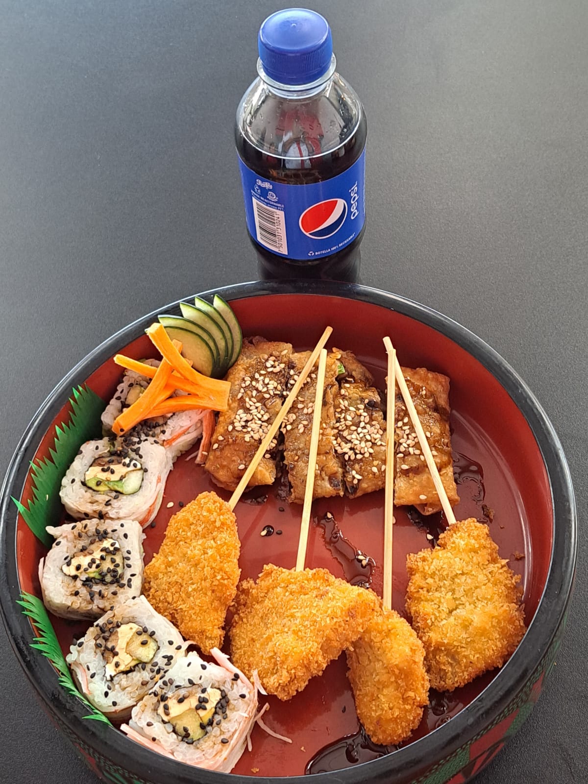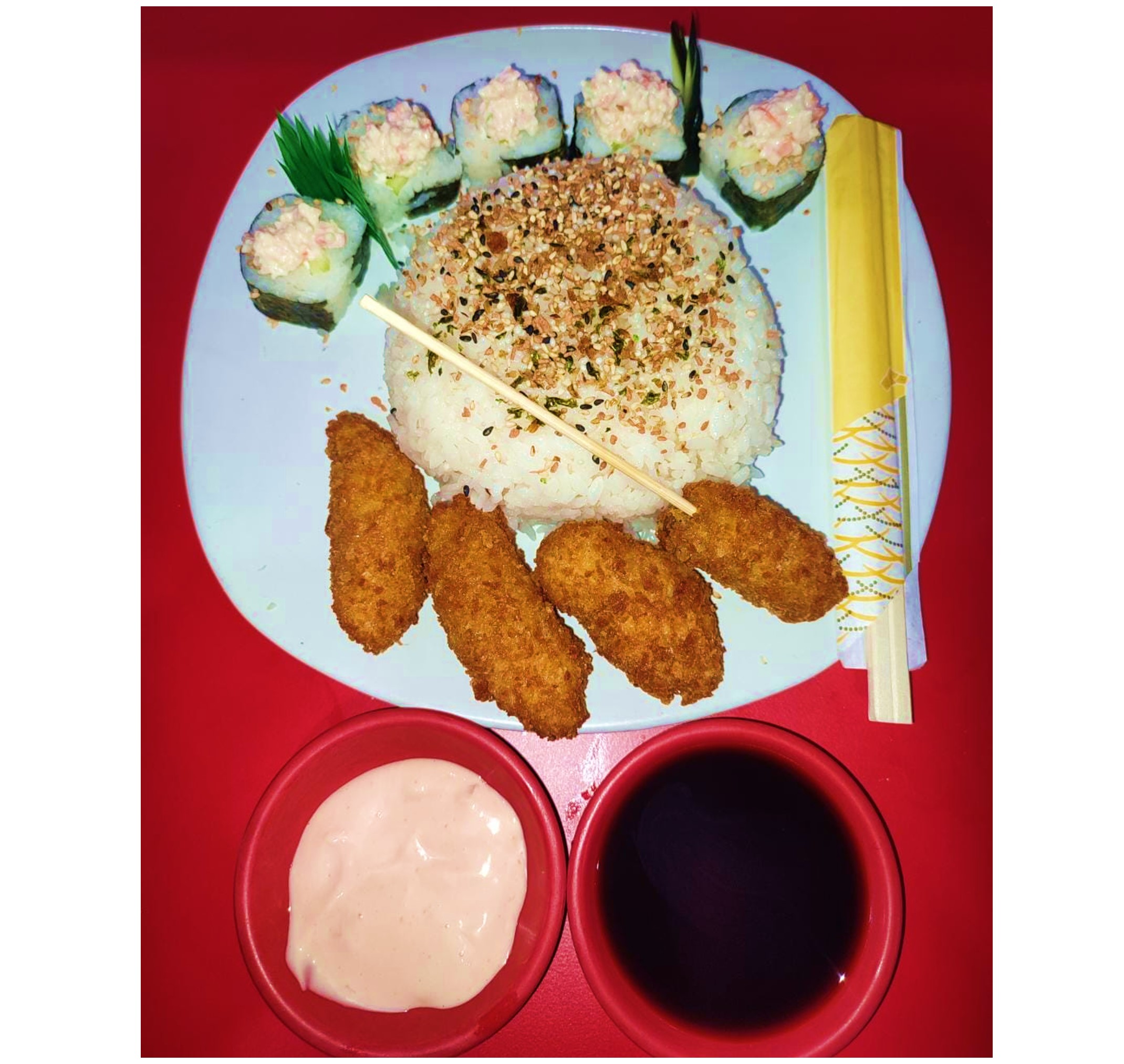 5 Pzas Rollo California*1 + 2 Pzas Kushiage Queso Manchego*1 + 2 Pzas Kushiage Plátano*1 + Media Porción Yakimeshi*1 + Refresco Coca-Cola (400 ml) (400 ml)*1
