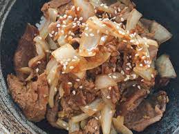 Filete de Res a la plancha con cebollin sobre una cama de arroz japones
