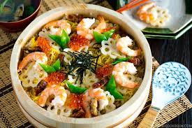 Arroz al vapor con condimentos de salmón o camarón.