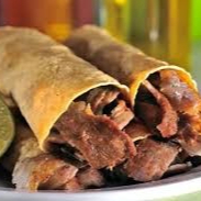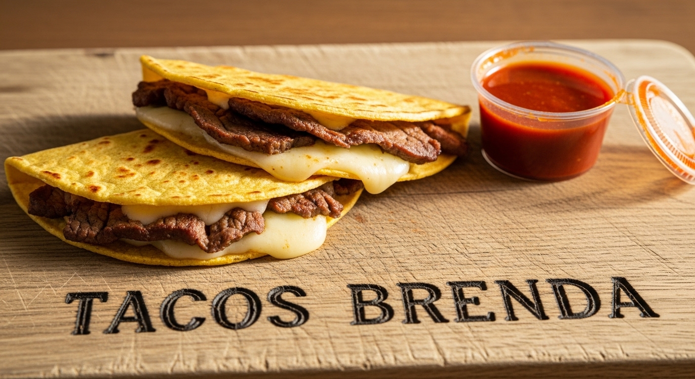 Taco con tortilla de maíz, carne árabe al carbón y quesillo derretido.