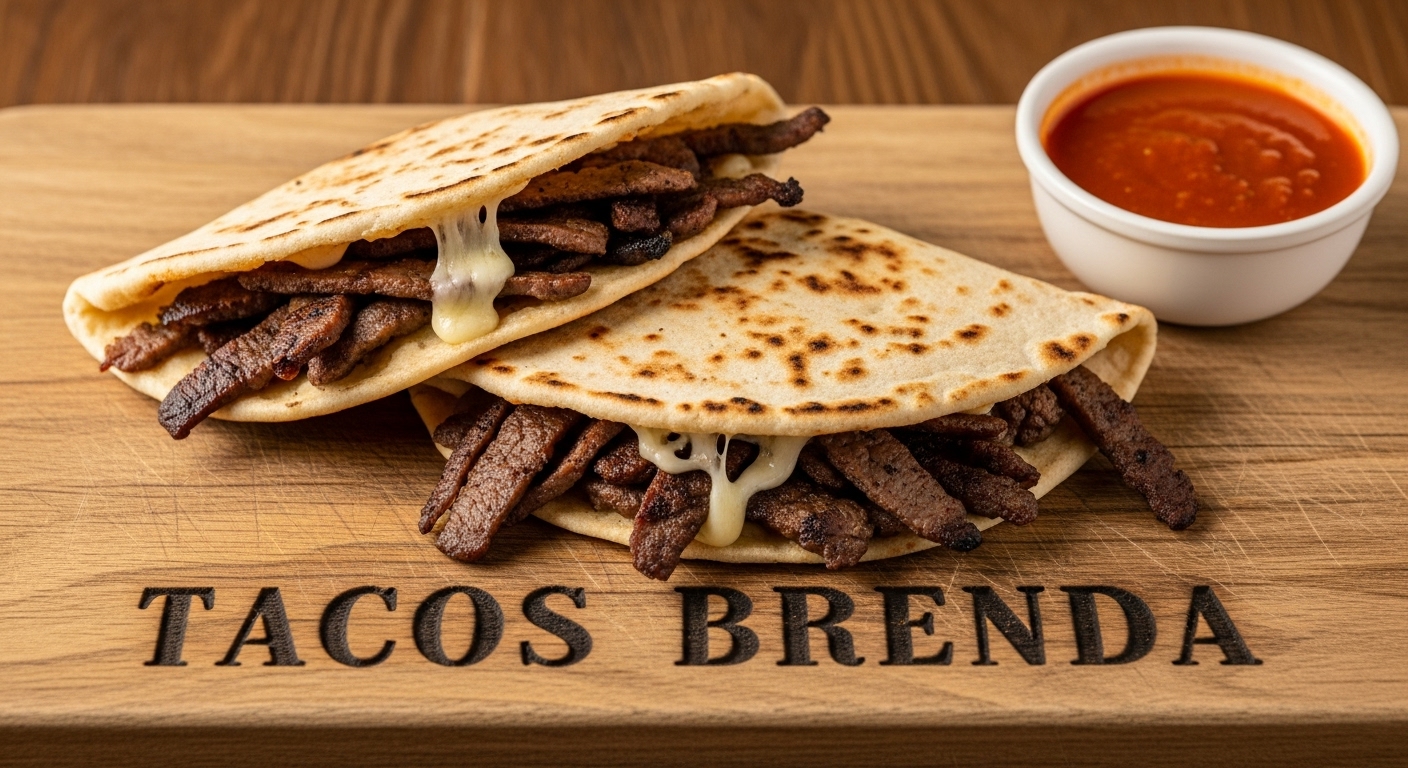 Grinda con doble tortilla de maíz, relleno de carne árabe y queso.