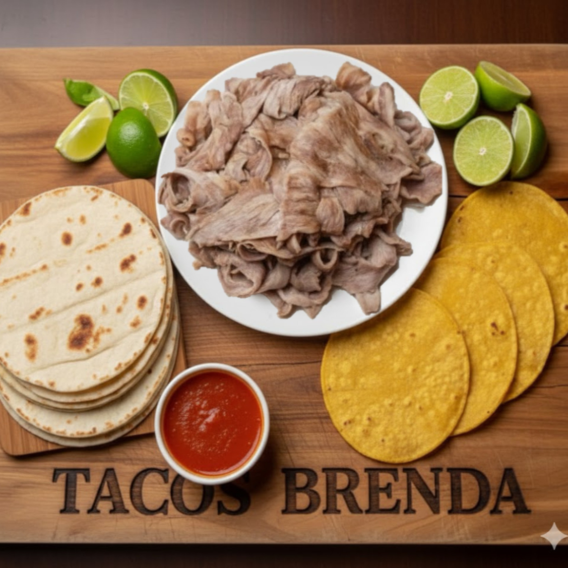 Medio kilo de carne árabe, 5 tortillas de harina, 5 tortillas de maíz, salsa y limones.