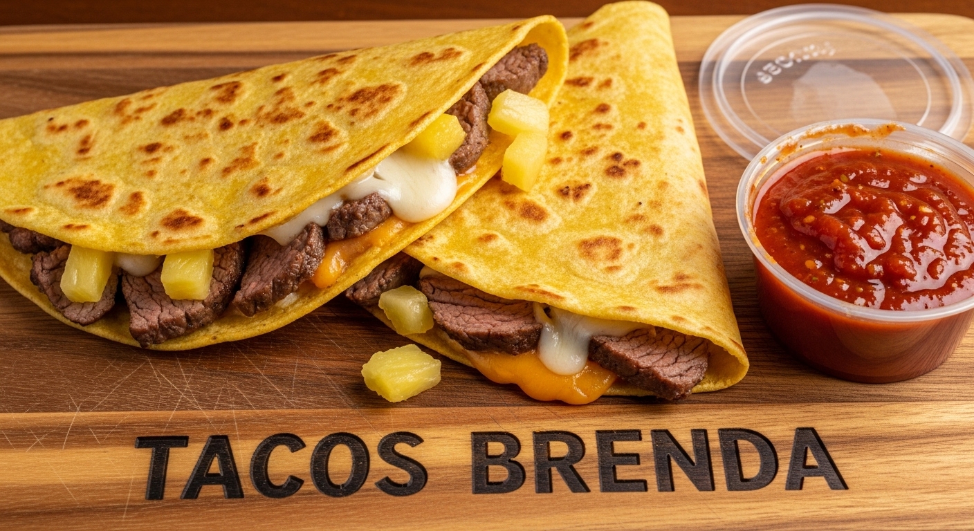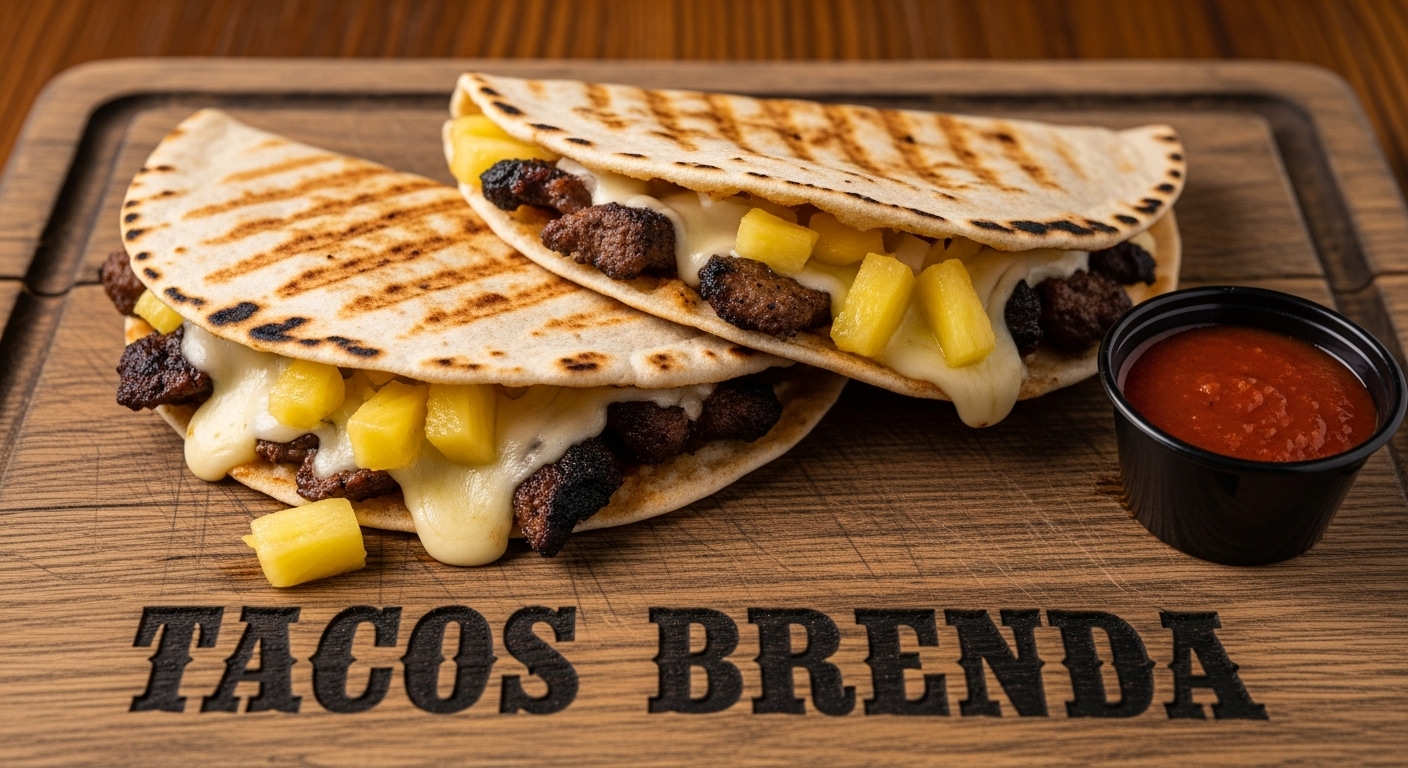 Grinda con doble tortilla de maíz, relleno de carne árabe, queso y piña.