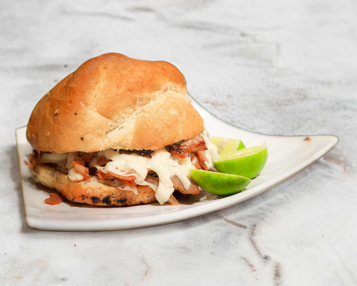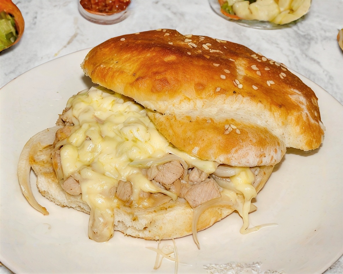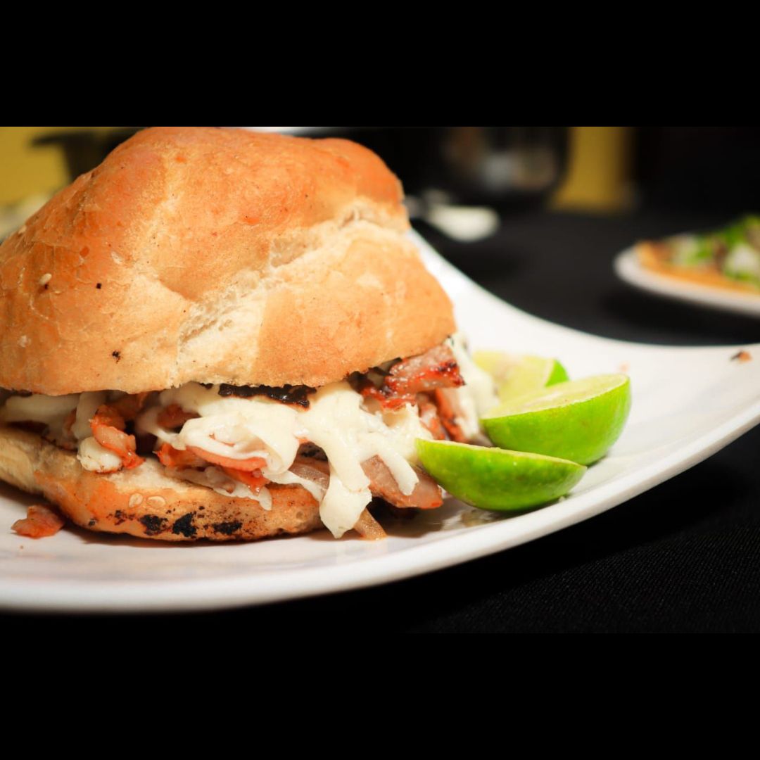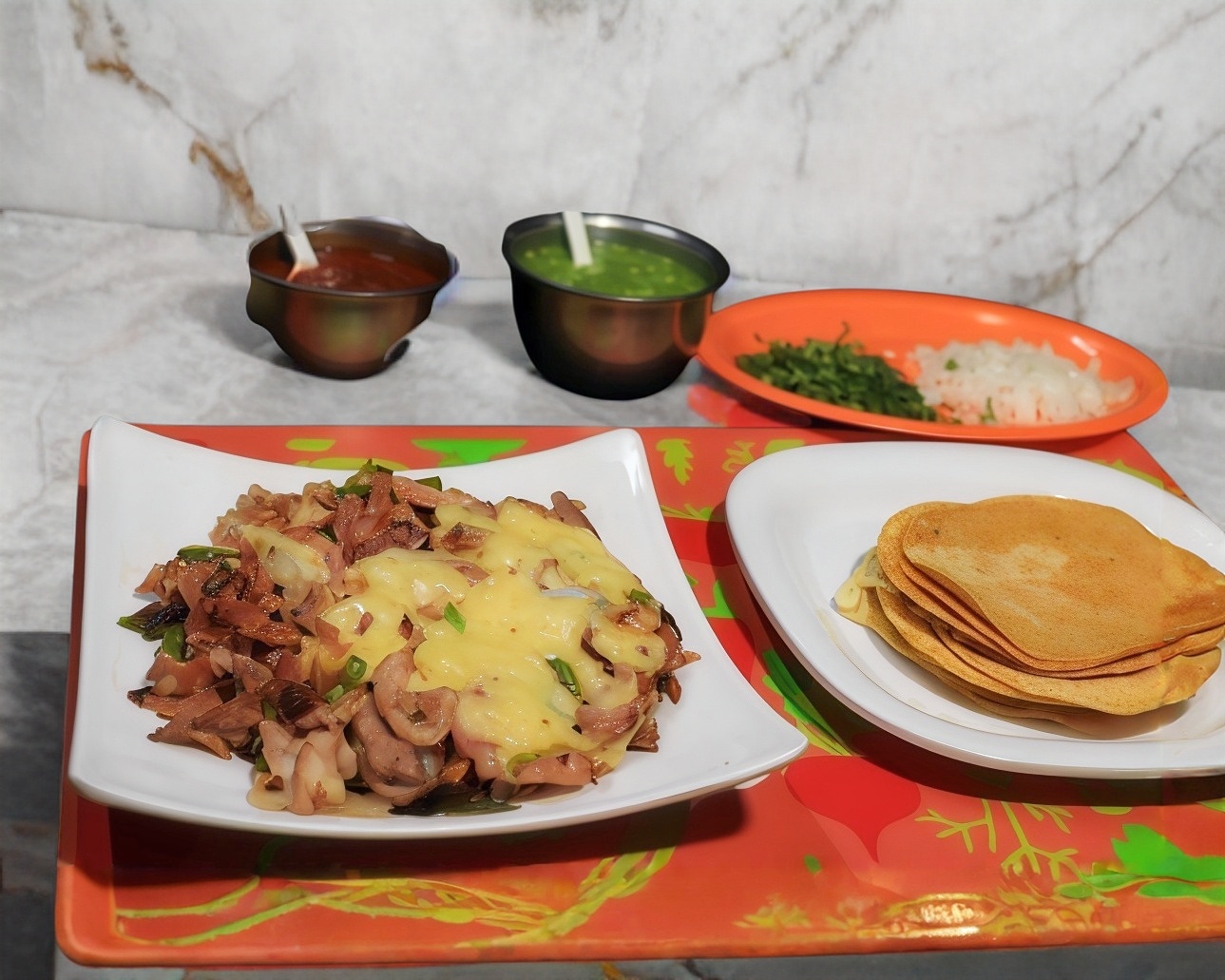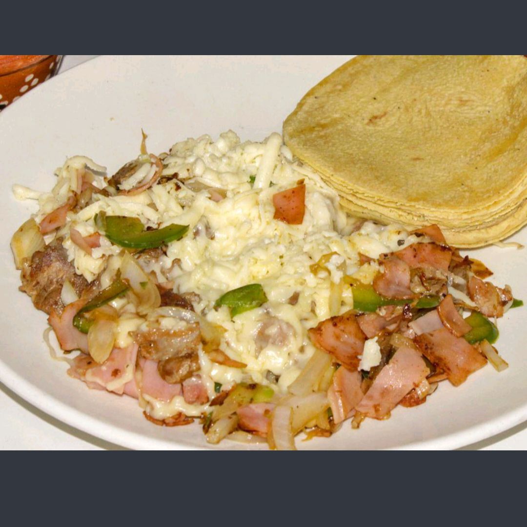 Bistec de res, jamón, queso, cebolla, chile morrón, tortillas de maíz.