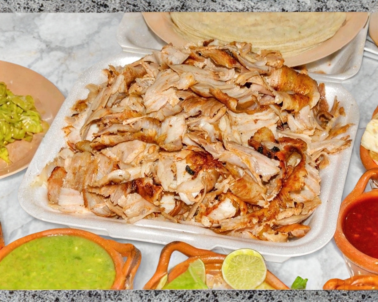 1 Kilo de carne al pastor , estilo único de tacos césar. Incluye 20 tortillas de maíz, 10 tortillas de harina, salsas roja y verde, piña, limones, cebolla y cilantro.