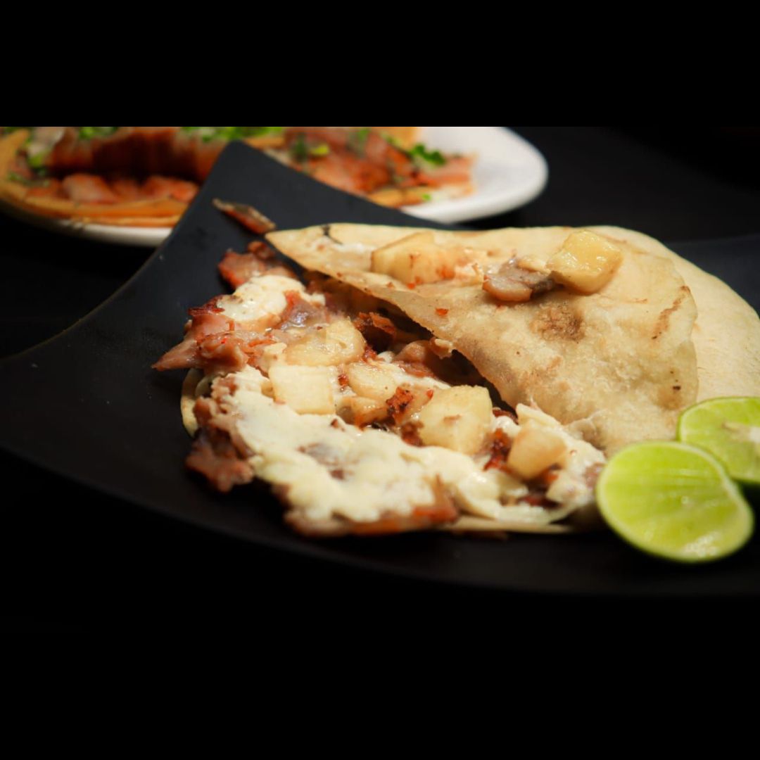 Carne al pastor, queso, piña y 2 tortillas de harina.