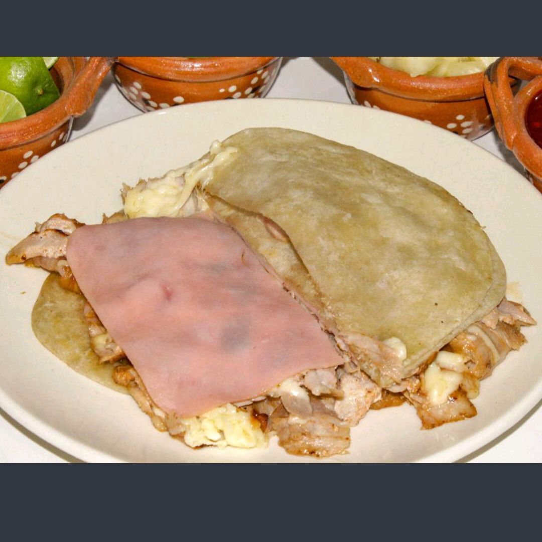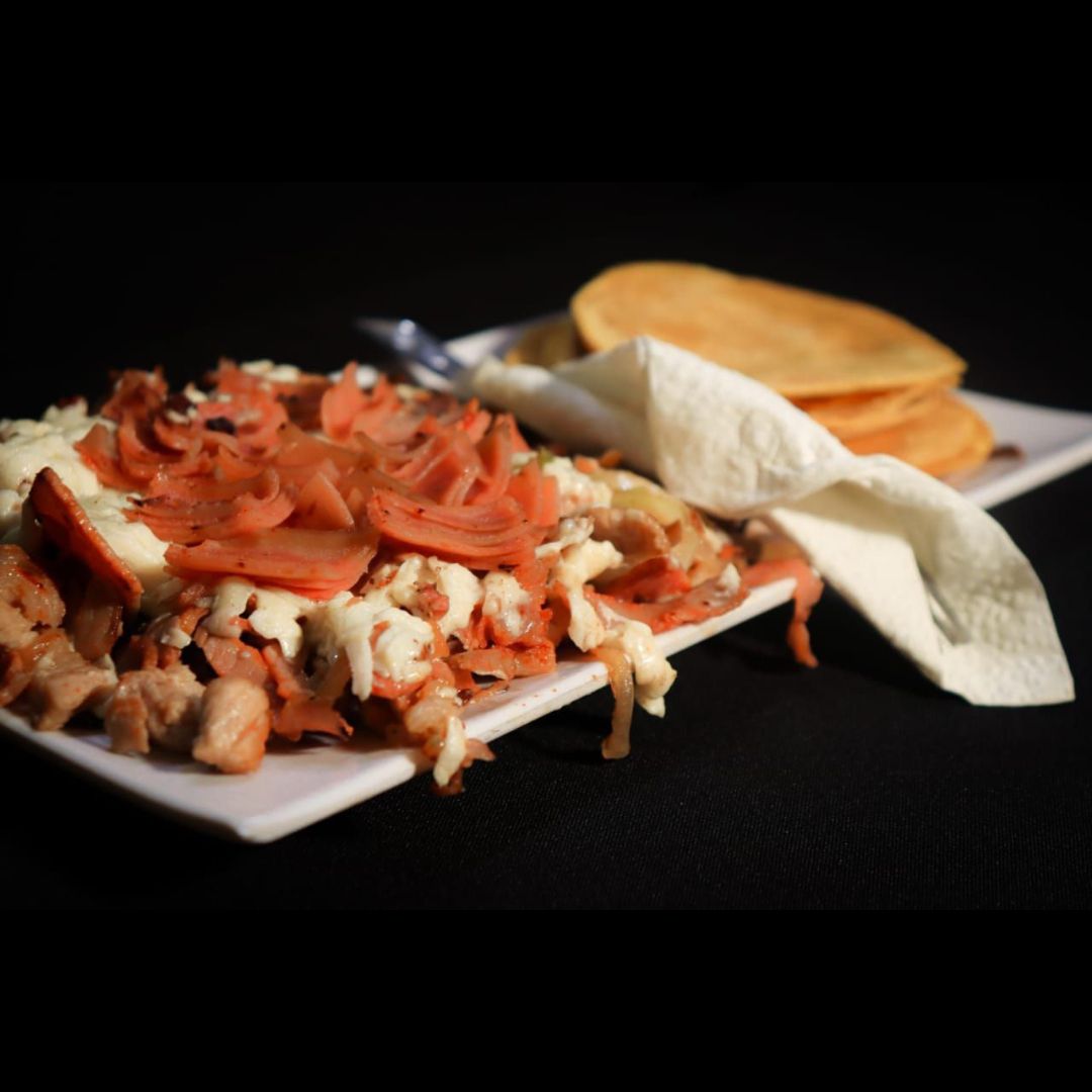 Carne al pastor, queso, jamón y 2 tortillas de harina.