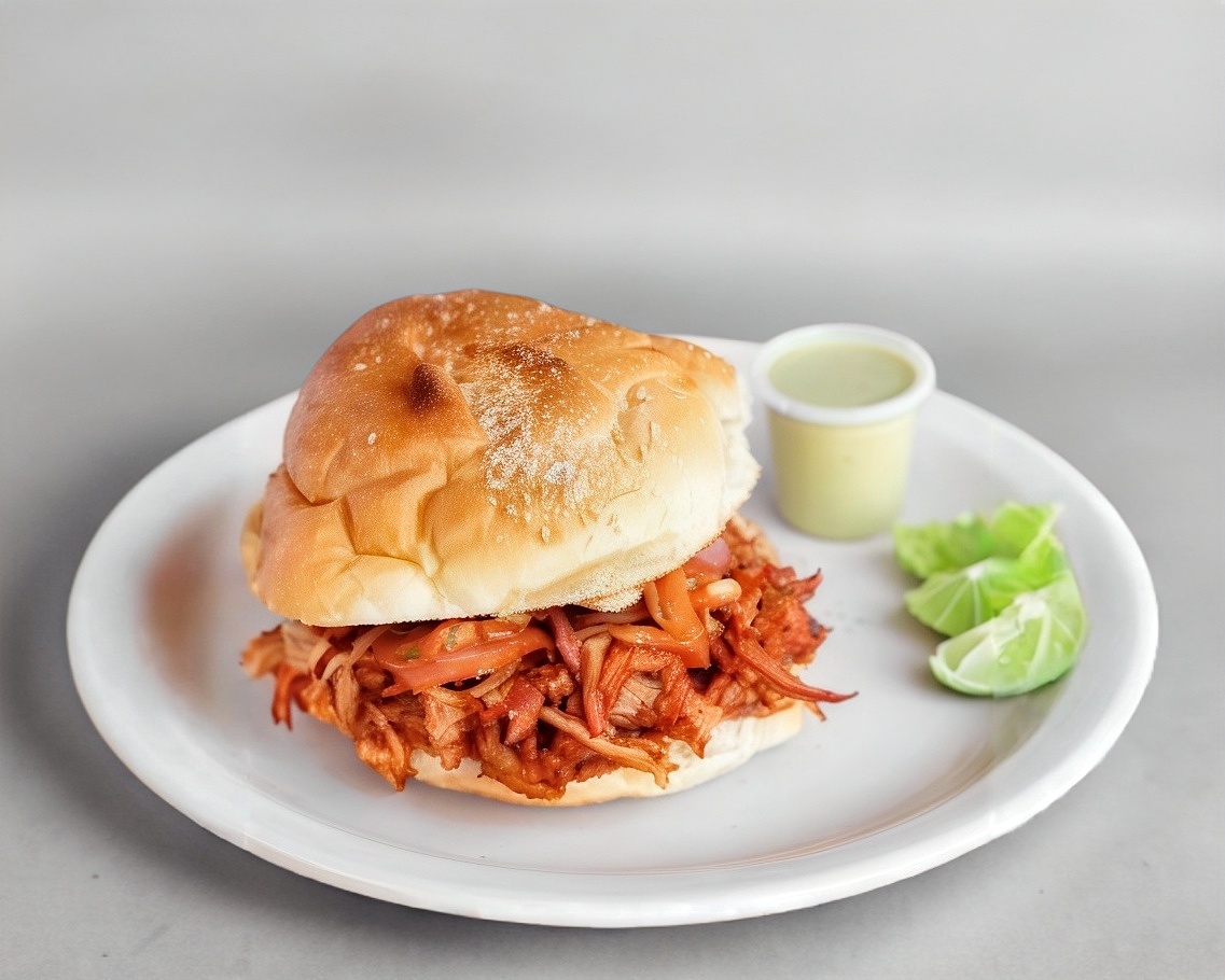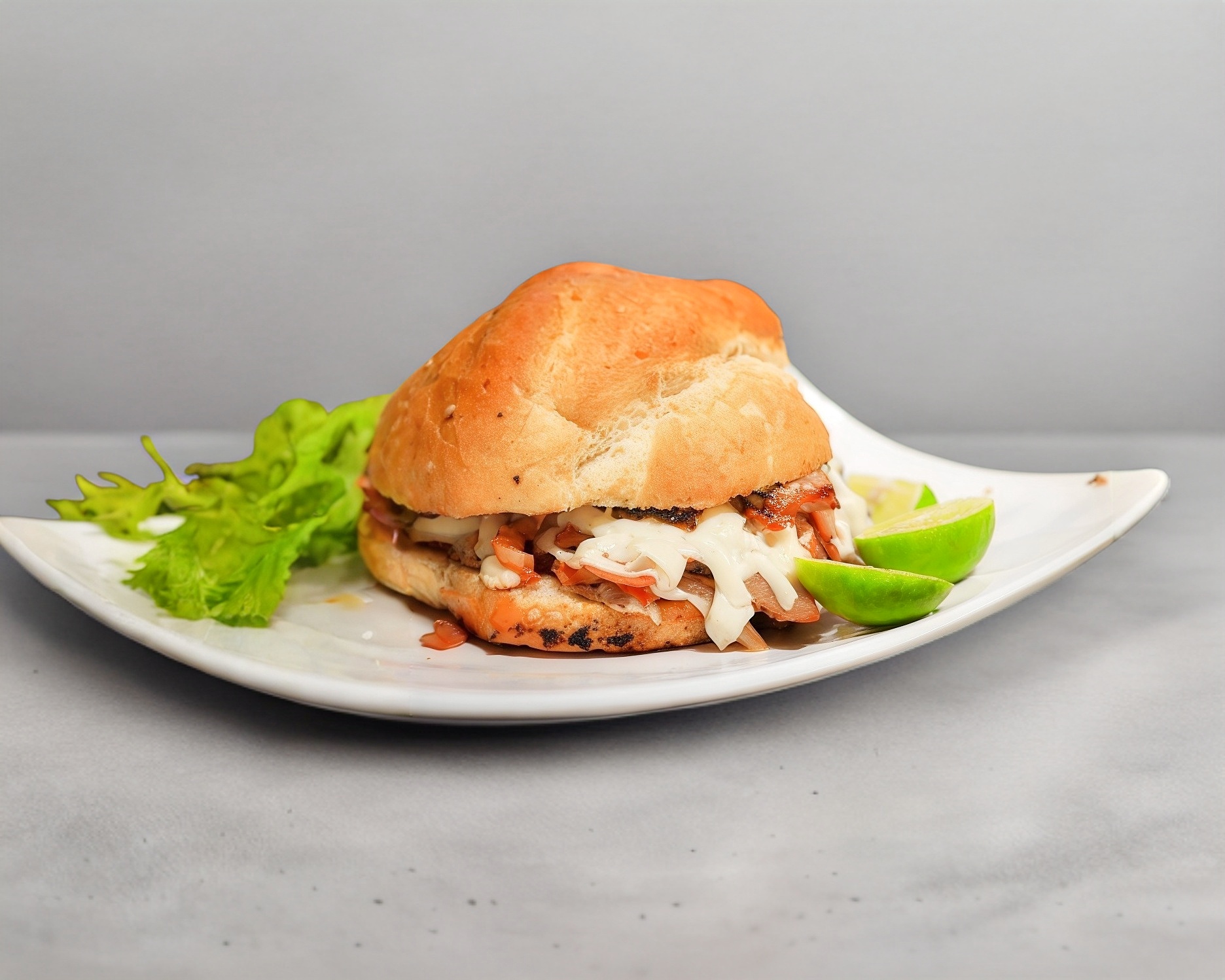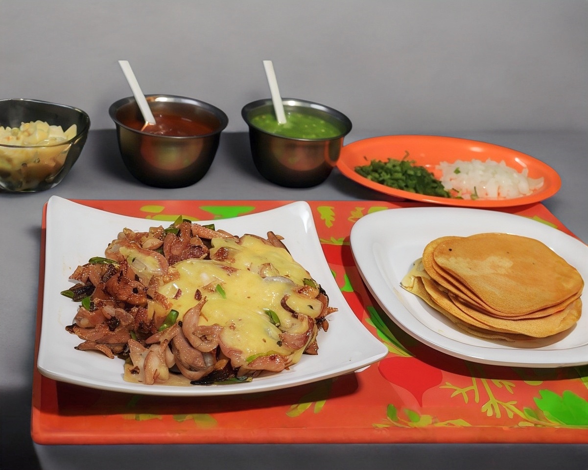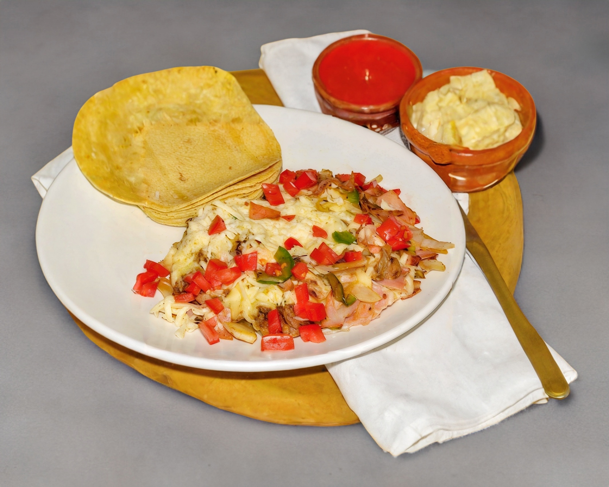 Bistec de res, jamón, queso, cebolla, chile morrón, tortillas de maíz.