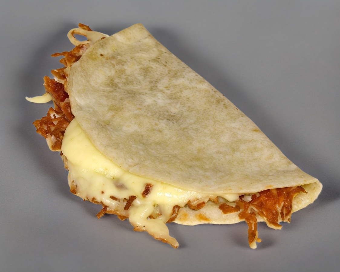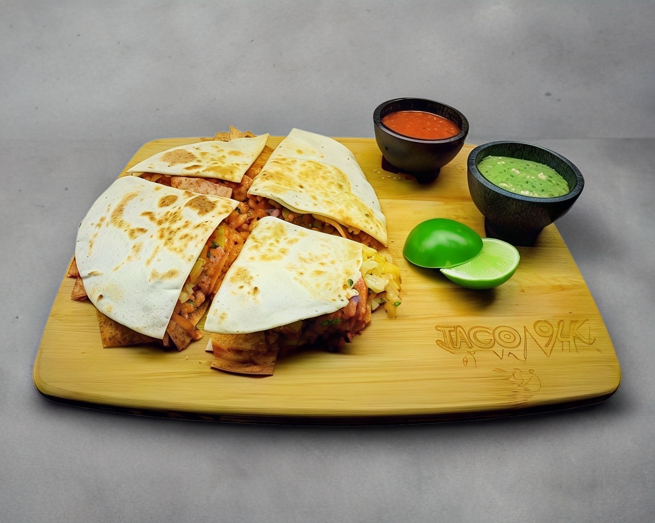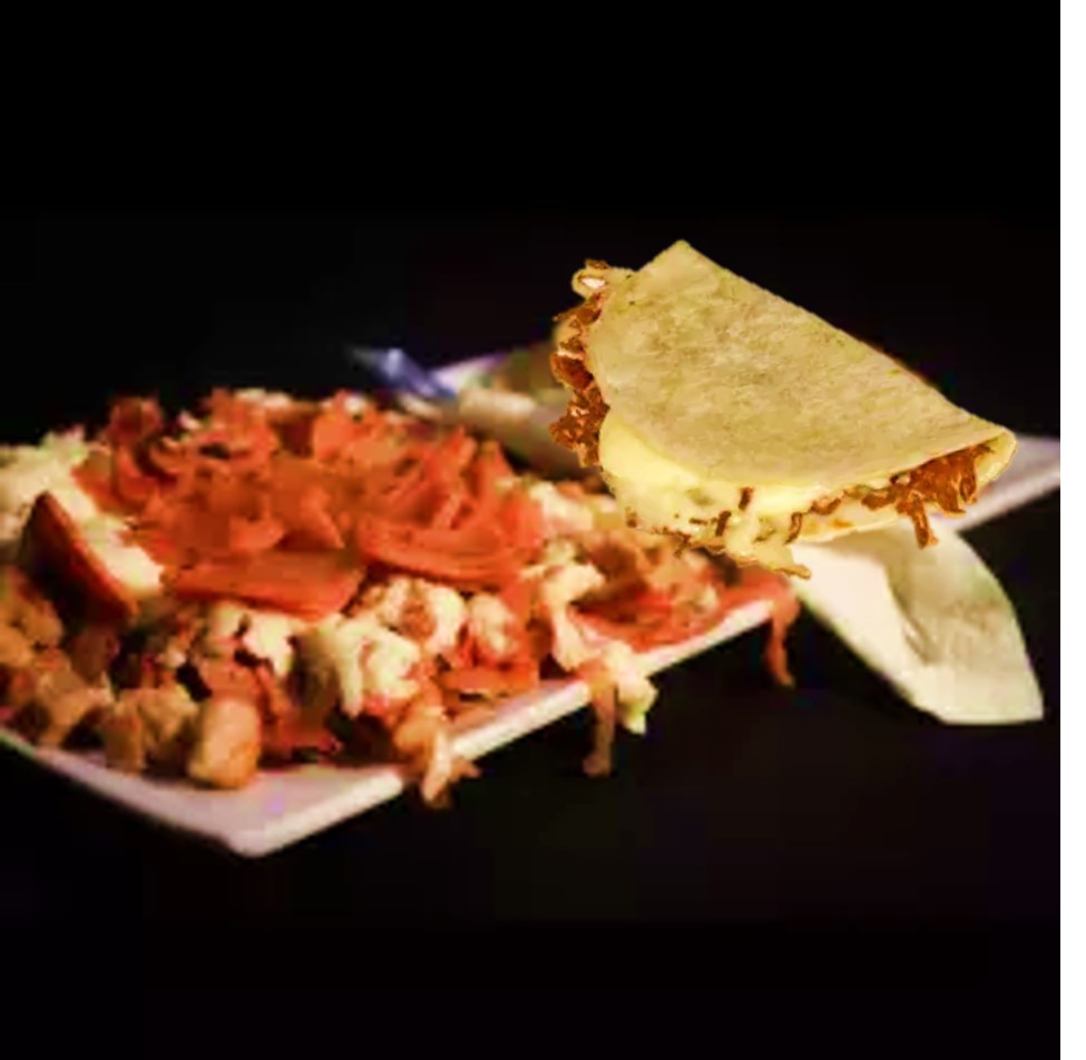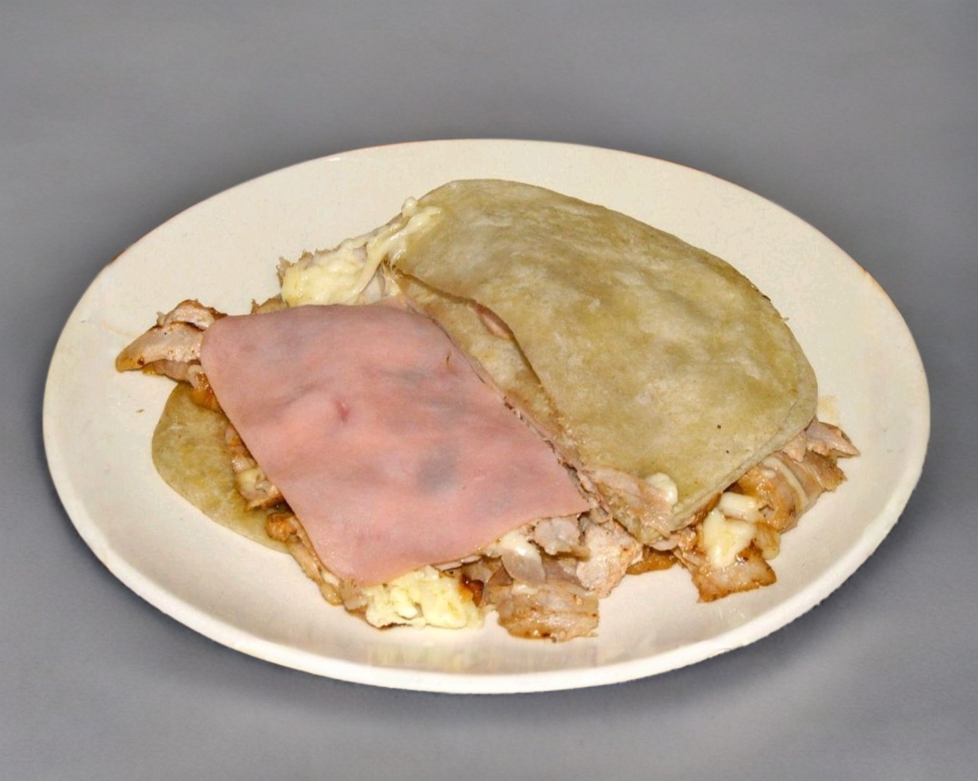 Carne al pastor, queso, jamón y dos tortillas de harina.