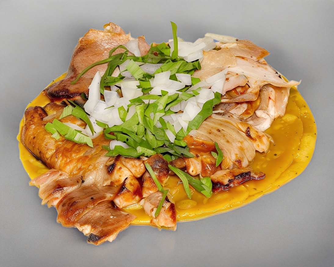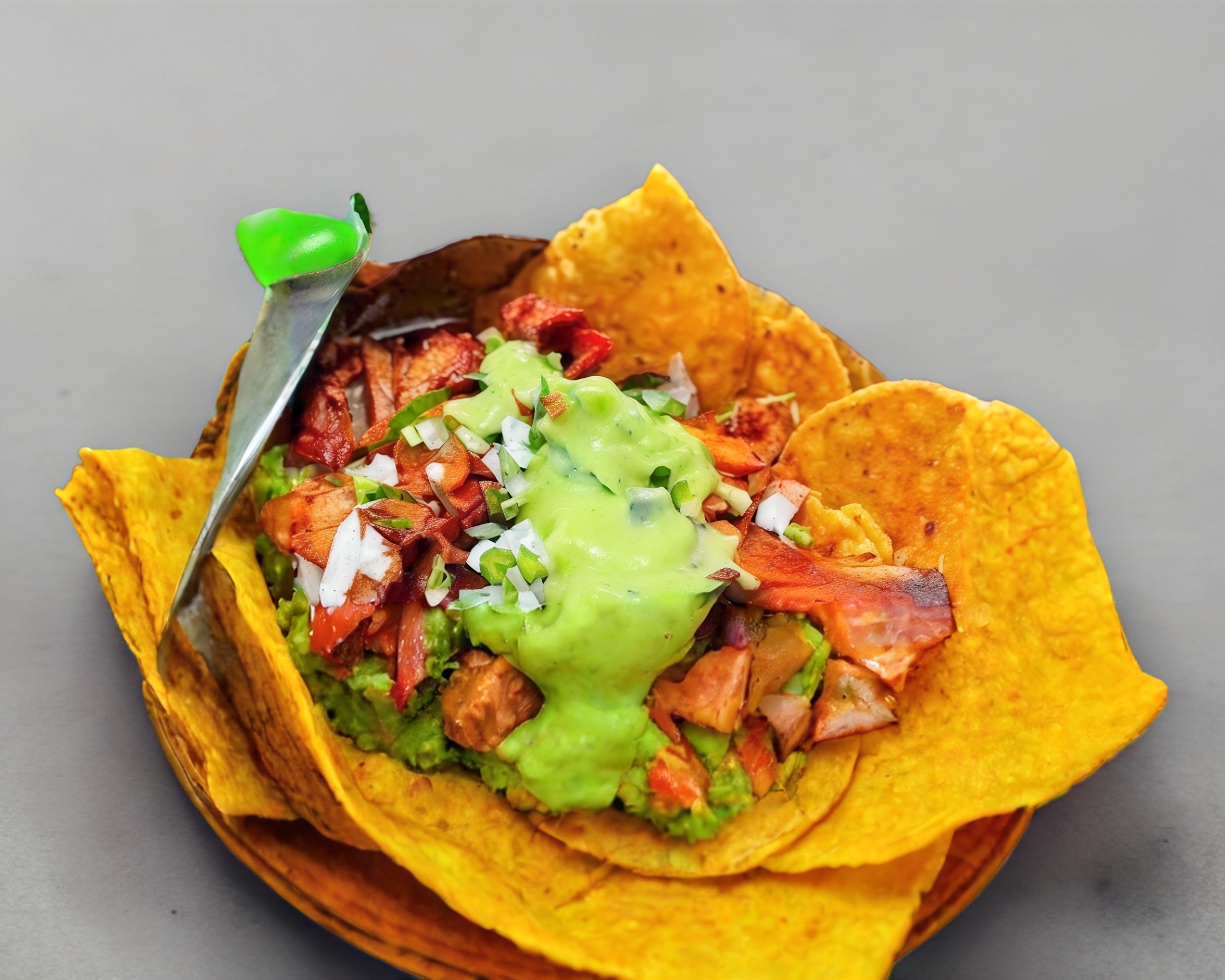 Carne al pastor, chuleta, tocino, jamón, cebolla, chile morrón, piña, queso, tortillas de maíz.