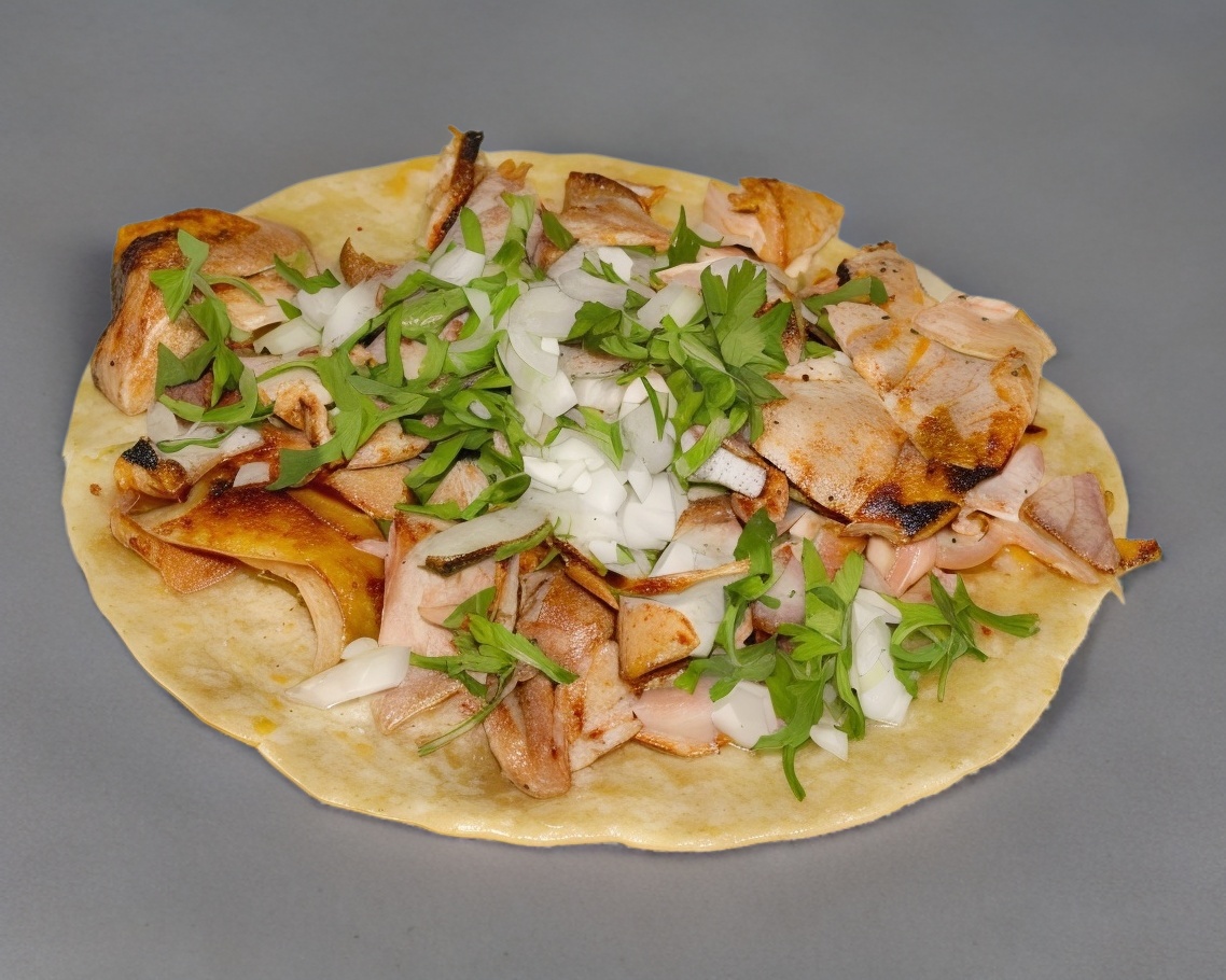 Chuleta, tocino, jamón, cebolla, carne al pastor, chile morrón, queso, tortillas de maíz.