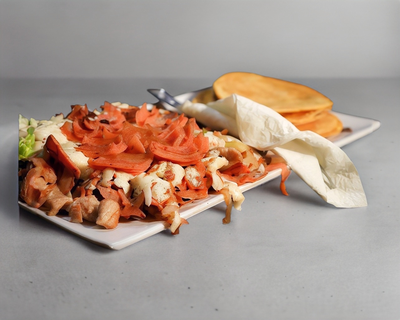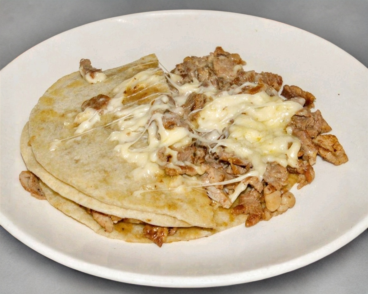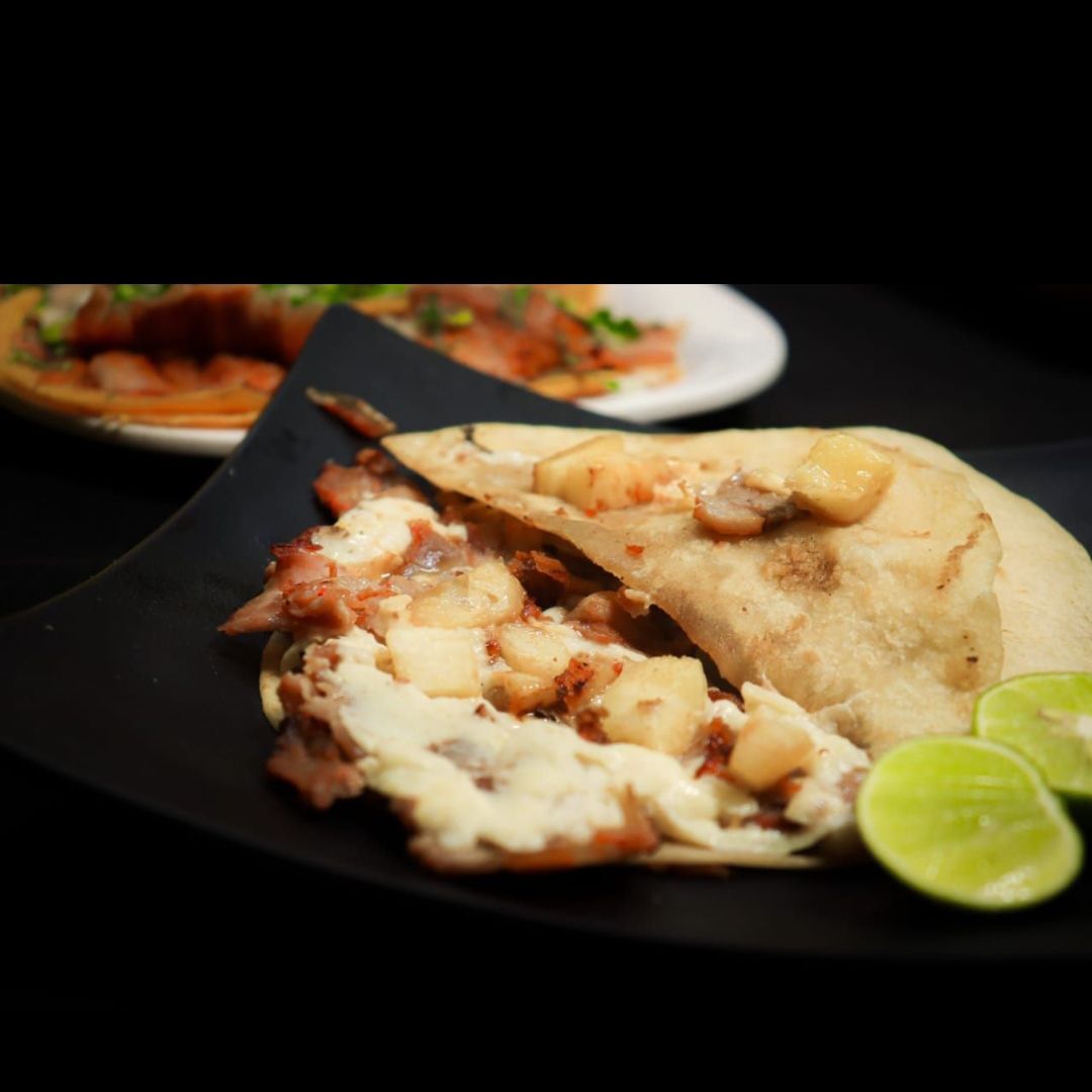Carne al pastor, Queso, y 2 tortillas de Harina.
