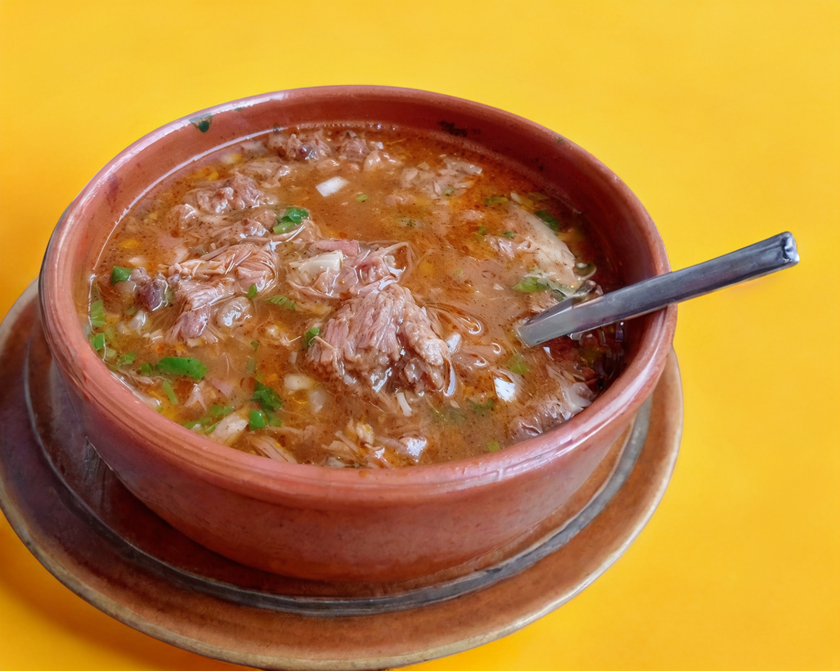 Totopos caseros, carne, frijoles puercos, consomé de birria, verdura, crema y aguacate.