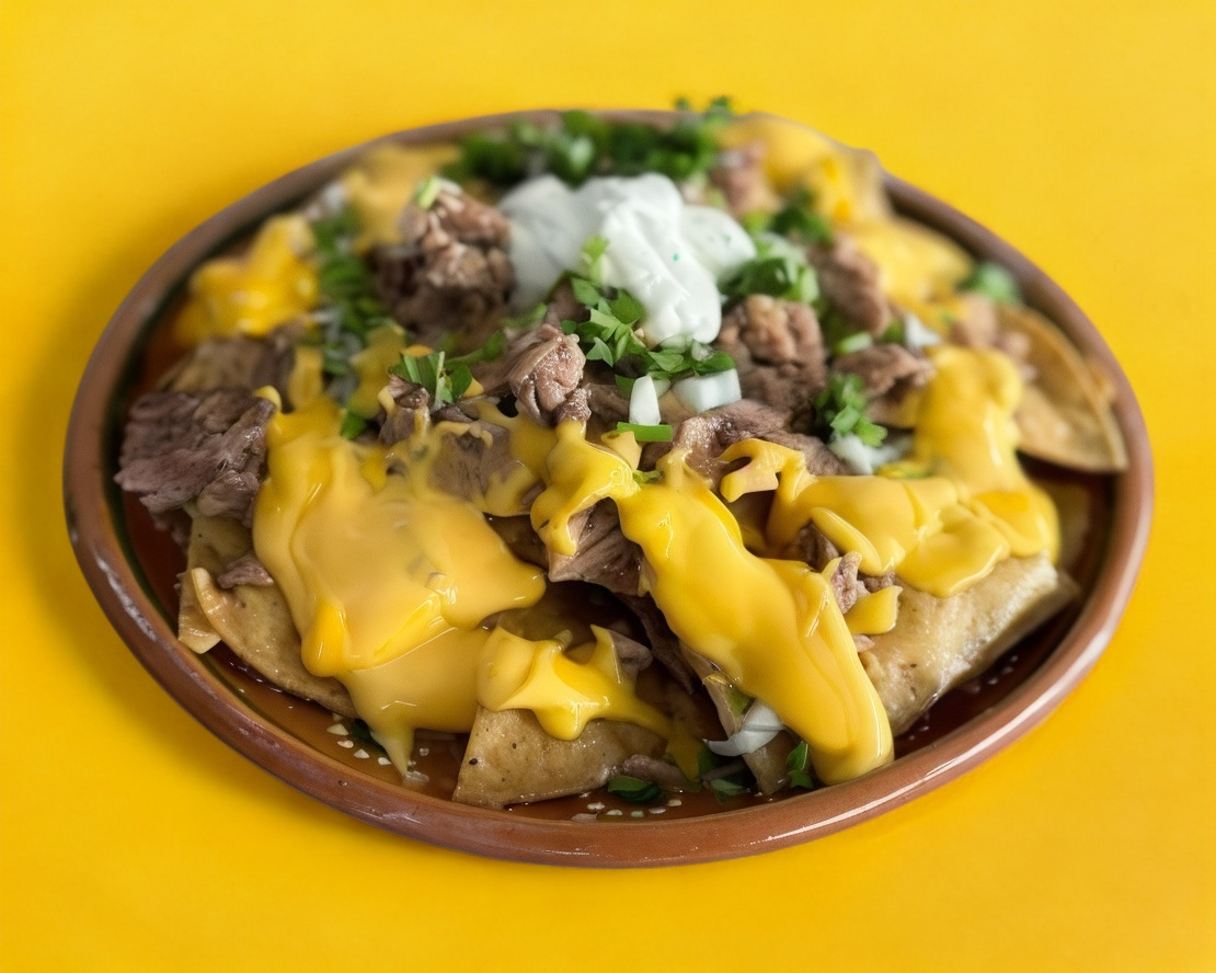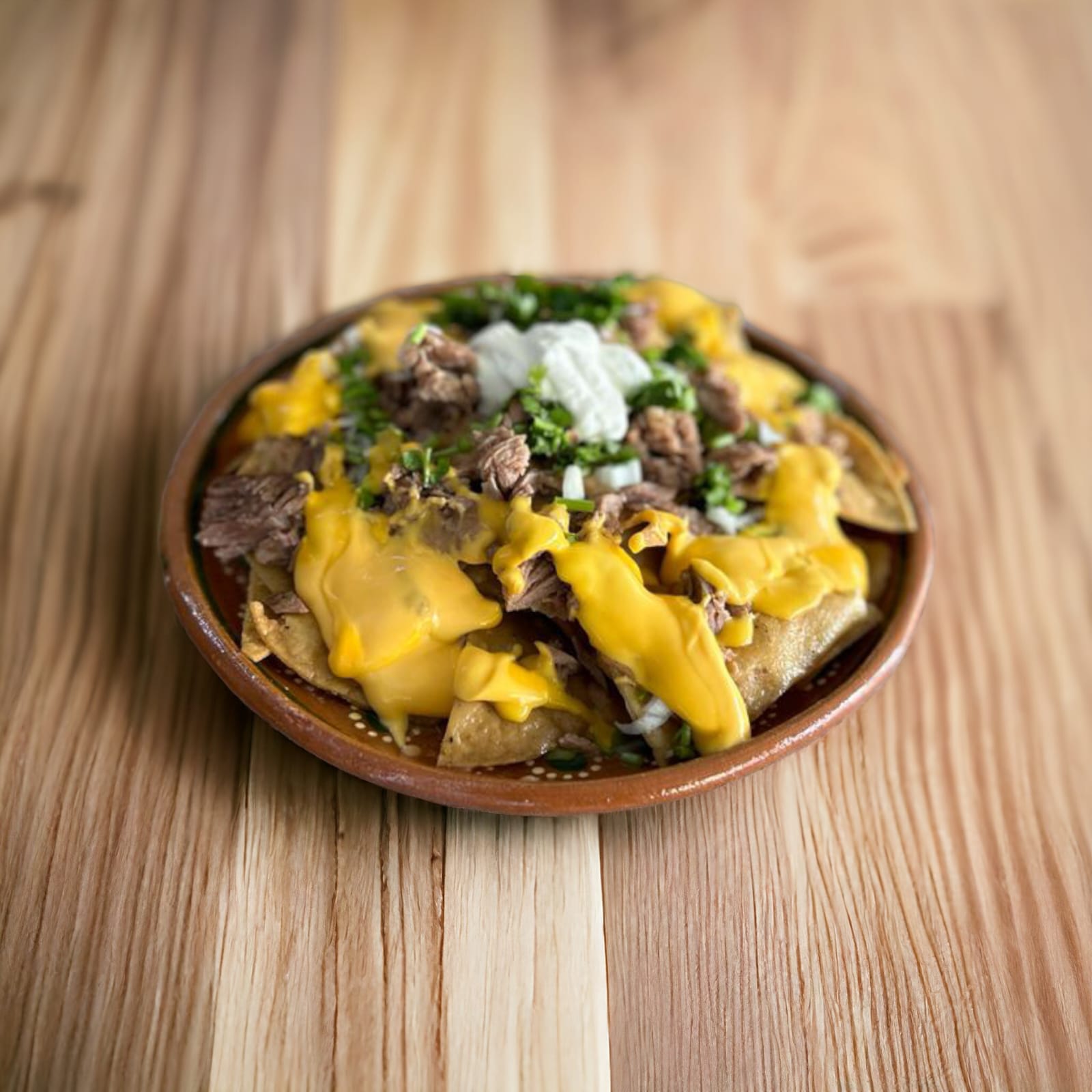 totopos caseros, sirloin ahumado, frijoles puercos, queso mozarela, queso amarillo, cebolla y cilantro