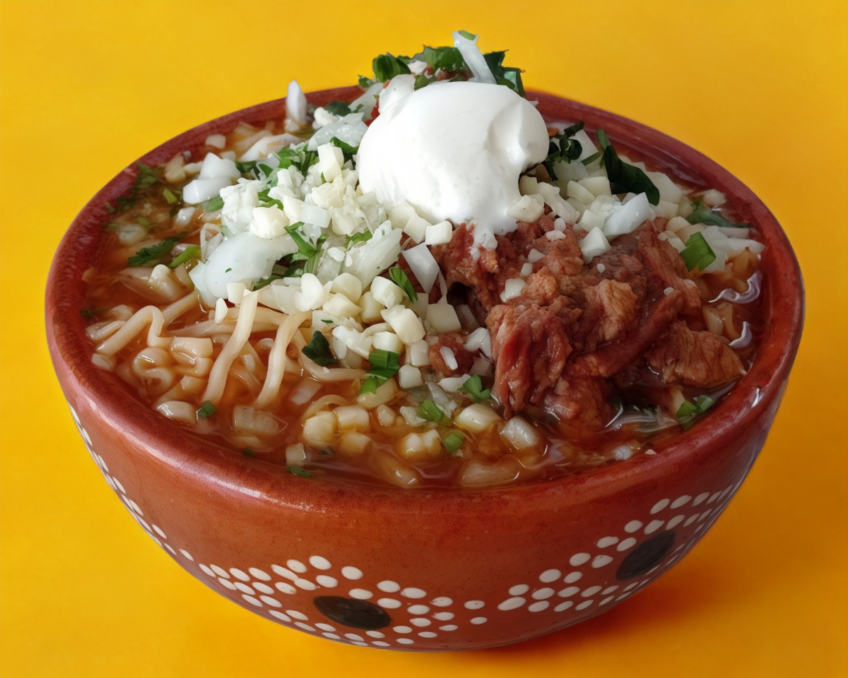 Birramen con birria o costilla o pulled beef consomé de birria, queso mozzarella, crema y verdura.