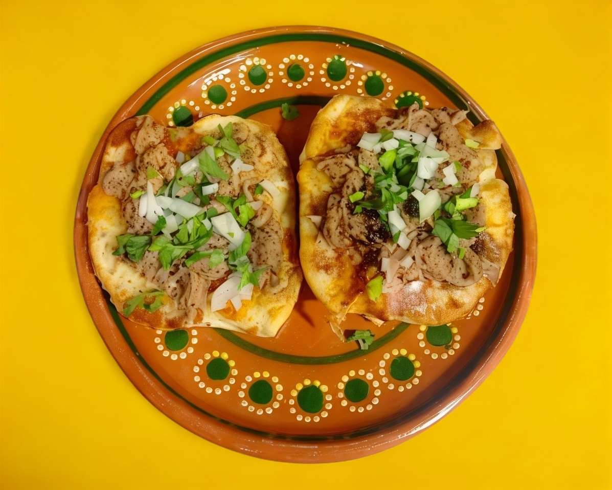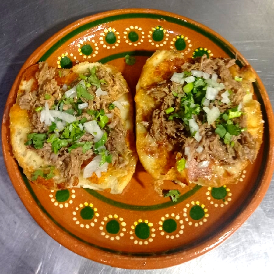 Molletes con birria, carne deshebrada y costilla. 2 pzas: pan, frijoles puercos, queso mozzarella y verdura.