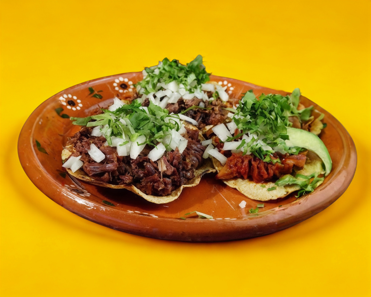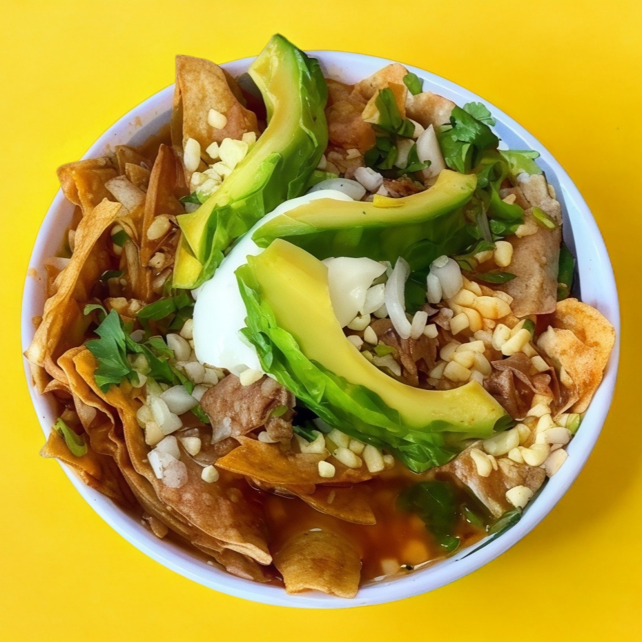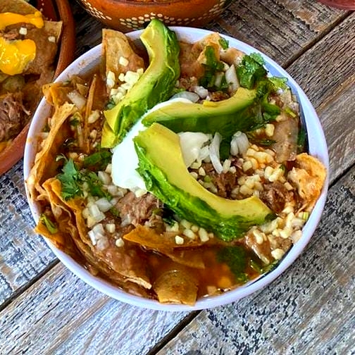 totopos caseros, carne, frijoles puercos, consomé de birria, cebolla, cilantro, queso mozzarella y aguacate