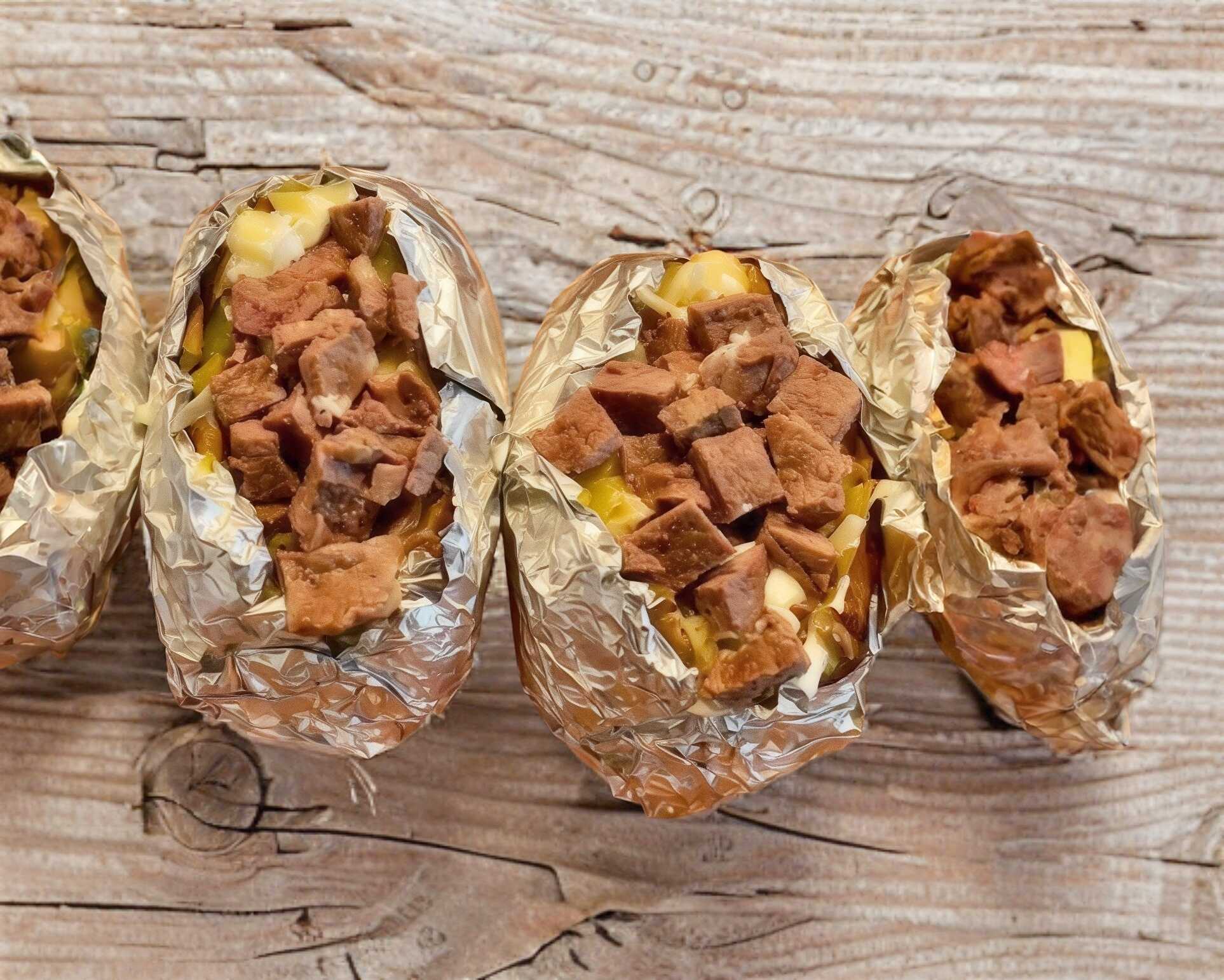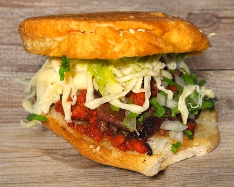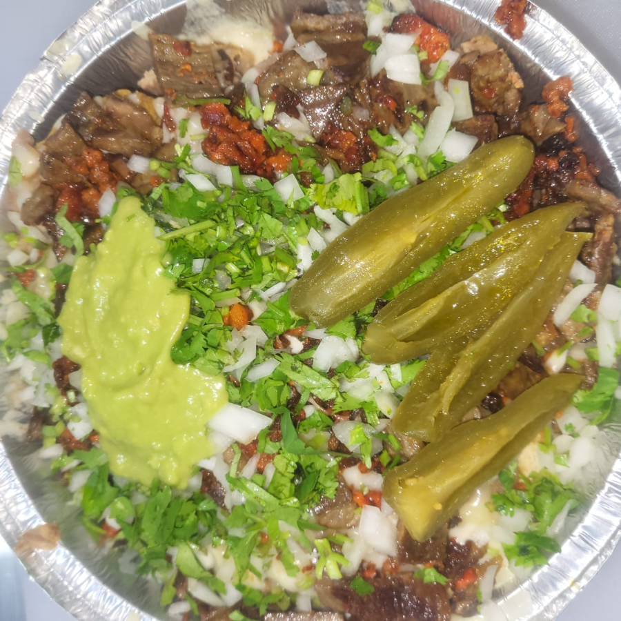 Carne asada, queso, cebolla, cilantro y guacamole.