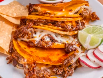 Mulita en tortilla de maíz con carne asada, longaniza o combinada y queso.