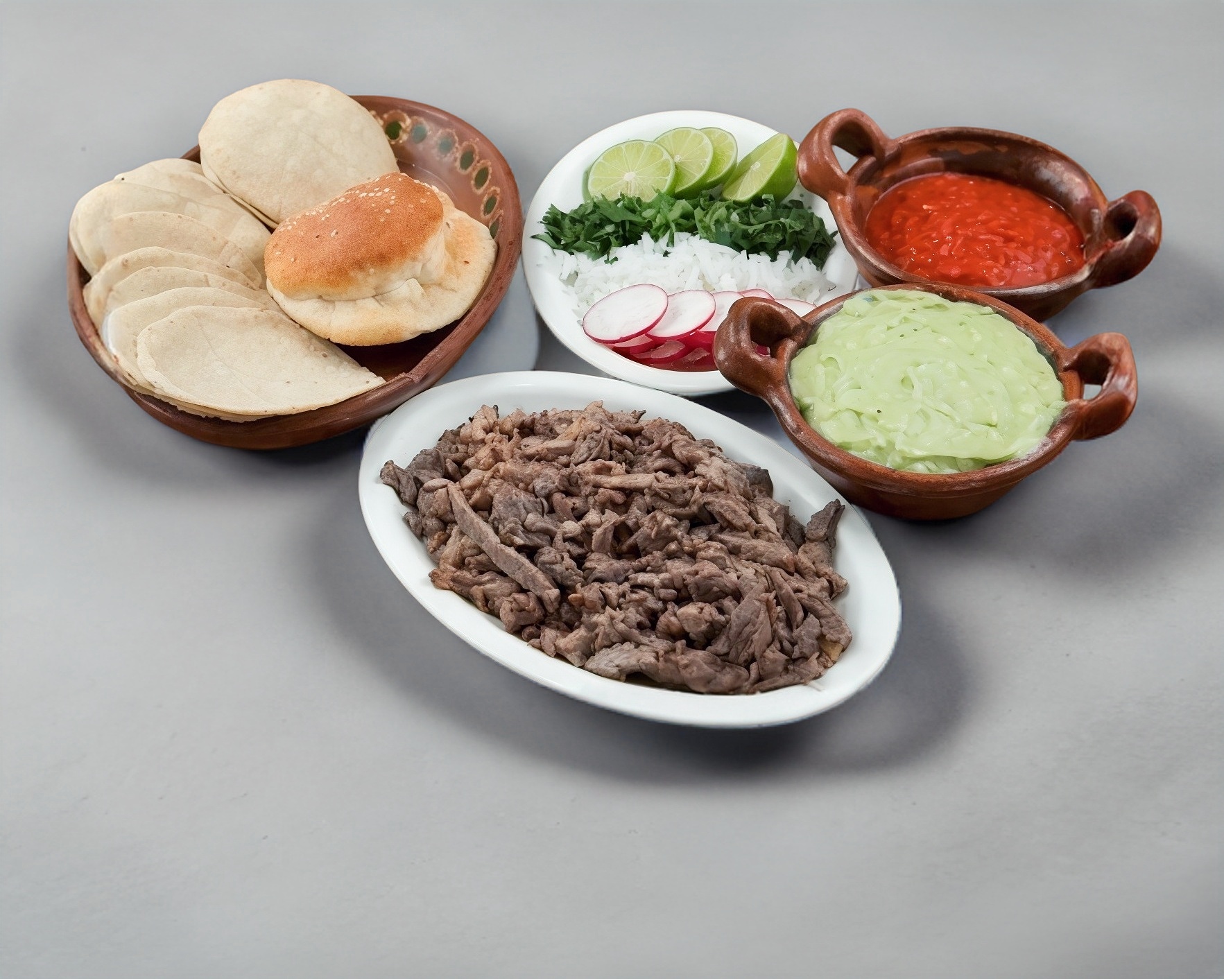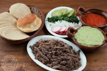Un kilogramo de carne asada, acompañado de tortillas, verdura y salsas.